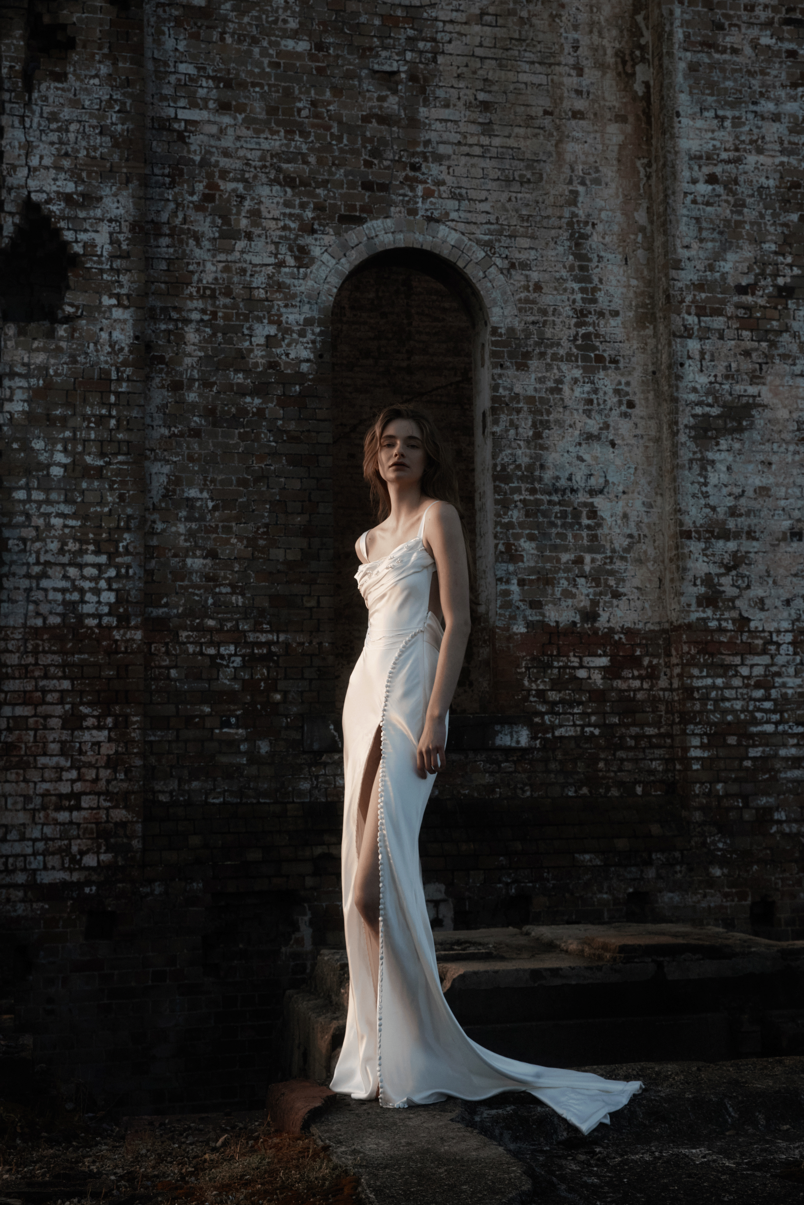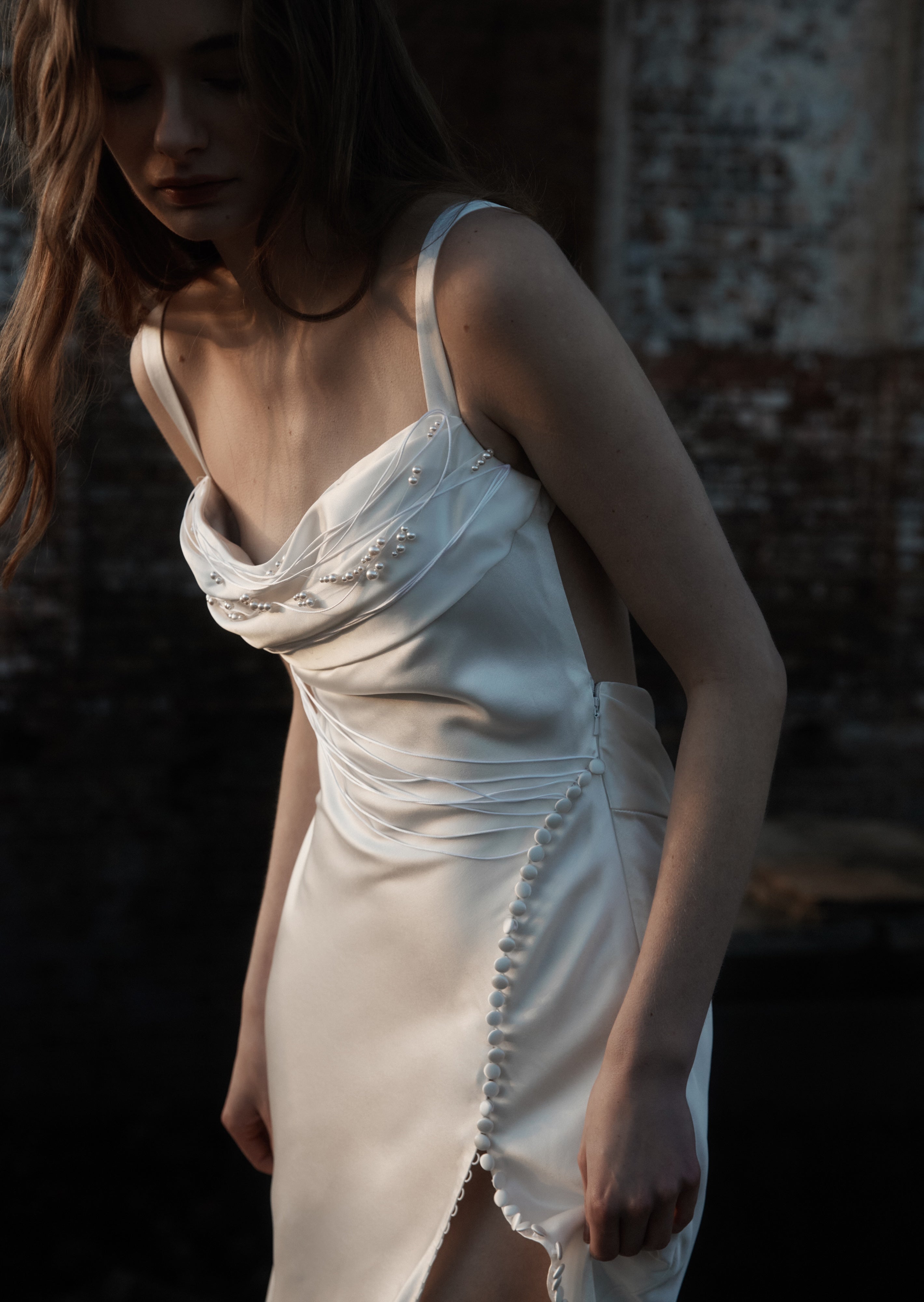 Buttons & loops opening split on fluid silk satin skirt, provides the option to show as much or as little leg as desired.