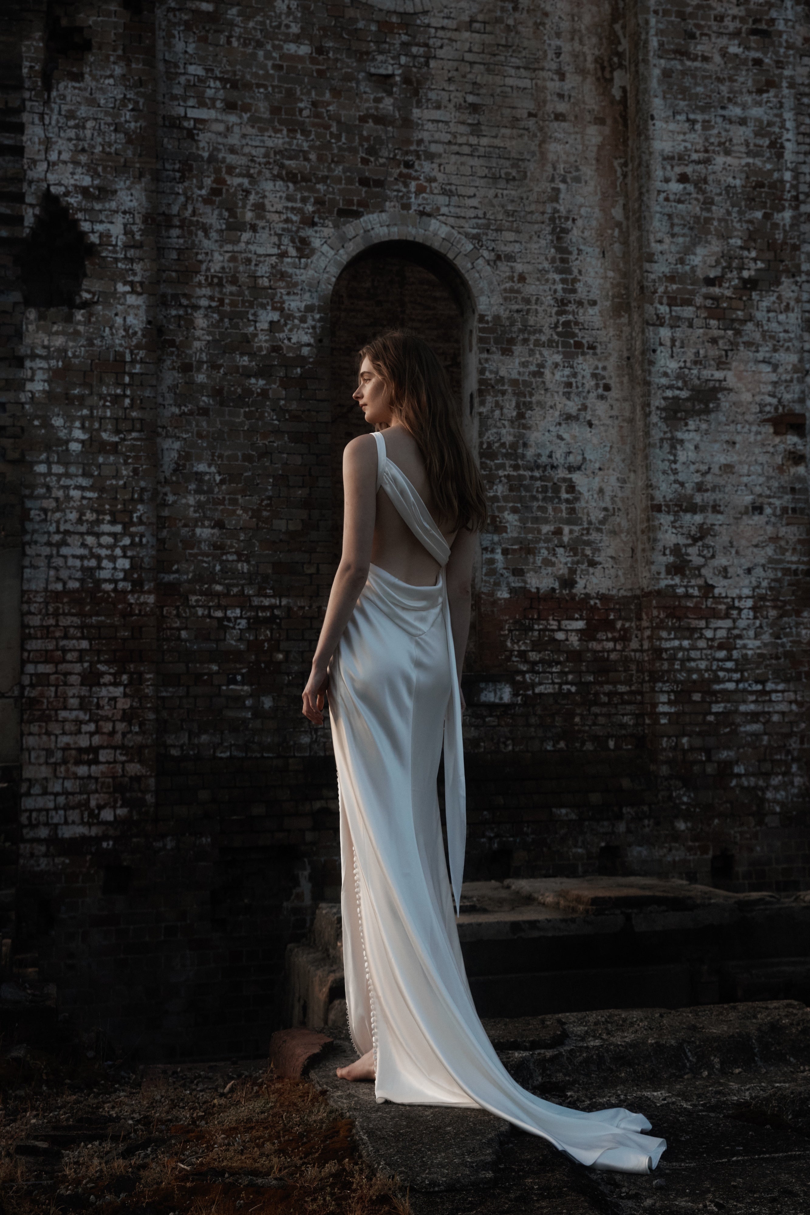 Low back style with delicate cowl and asymmetrical draping statement piece from shoulder to waist.