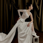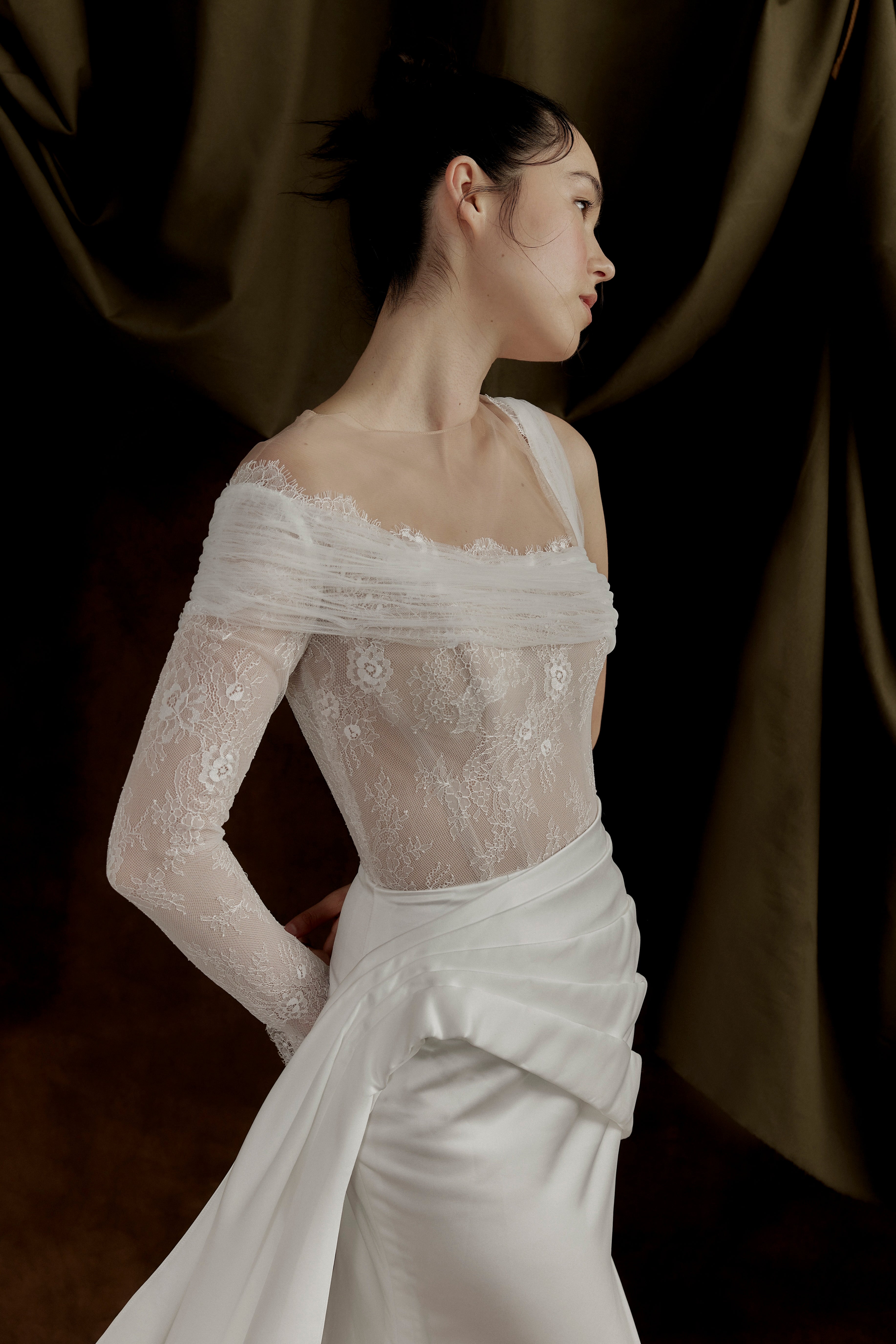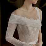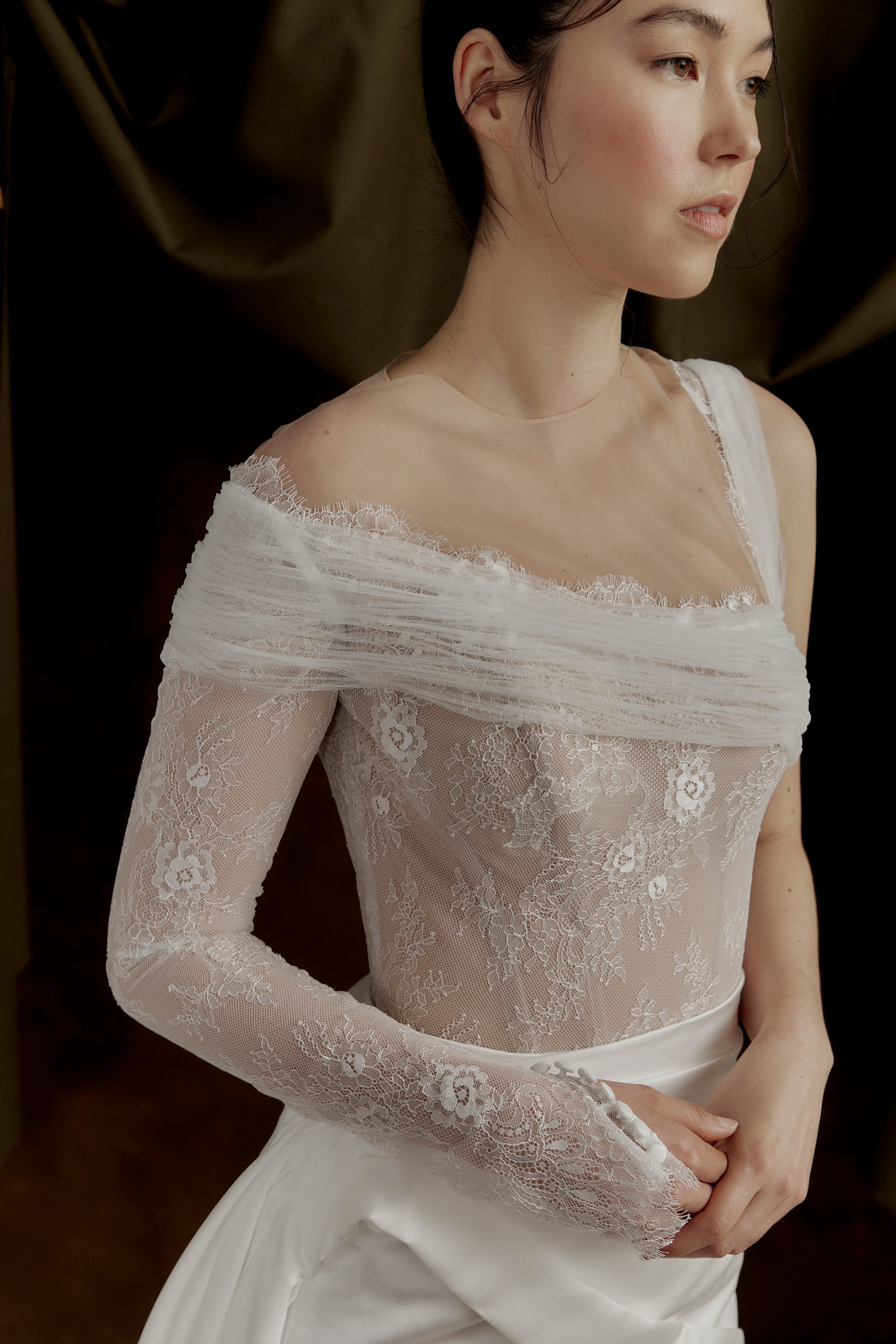 Asymmetrical one-shoulder gown with Chantilly details & pleated tulle draped across the bust and sleeves. Luscious duchess satin skirt with asymmetrical draping over front of skirt to side skirt train.