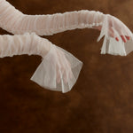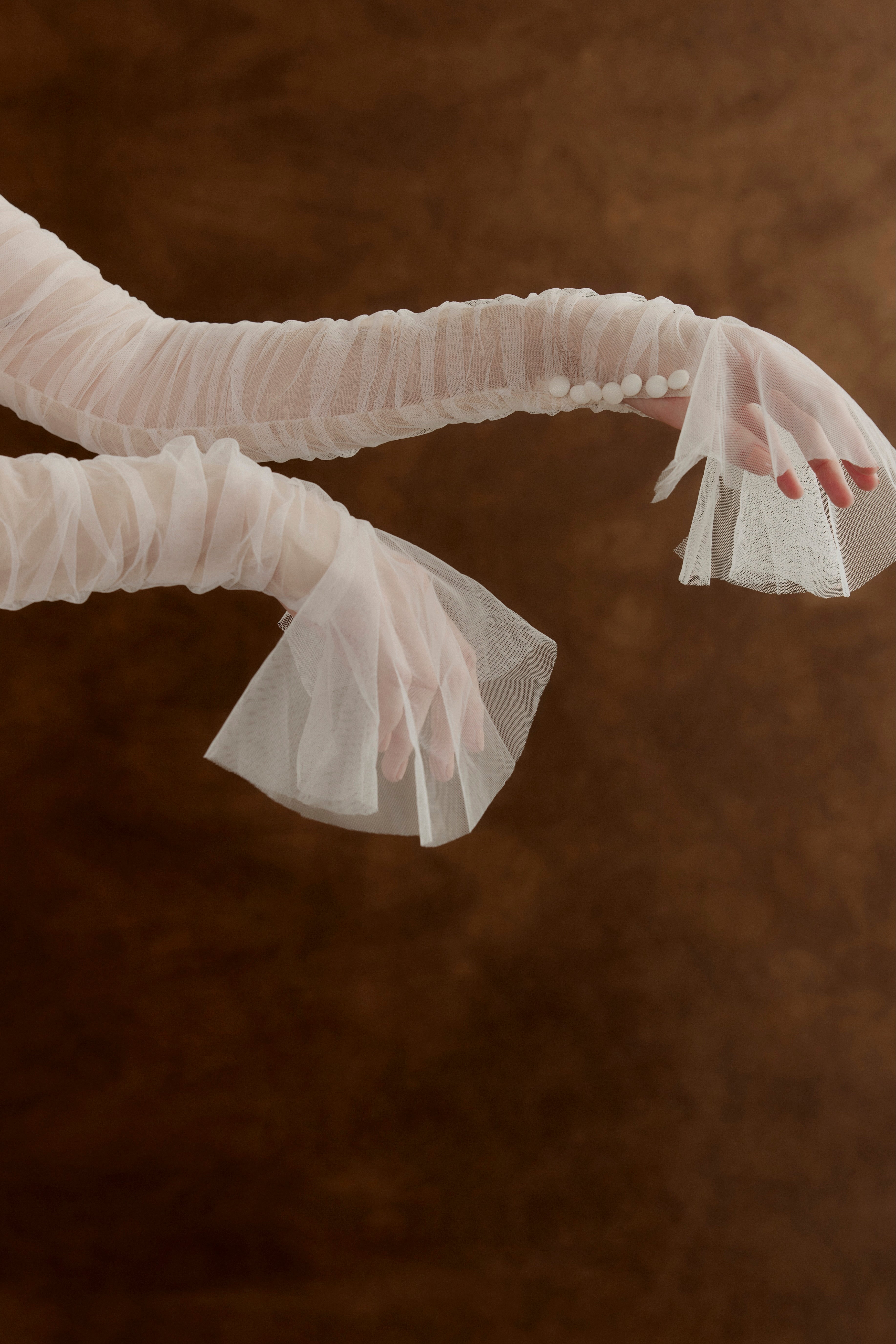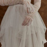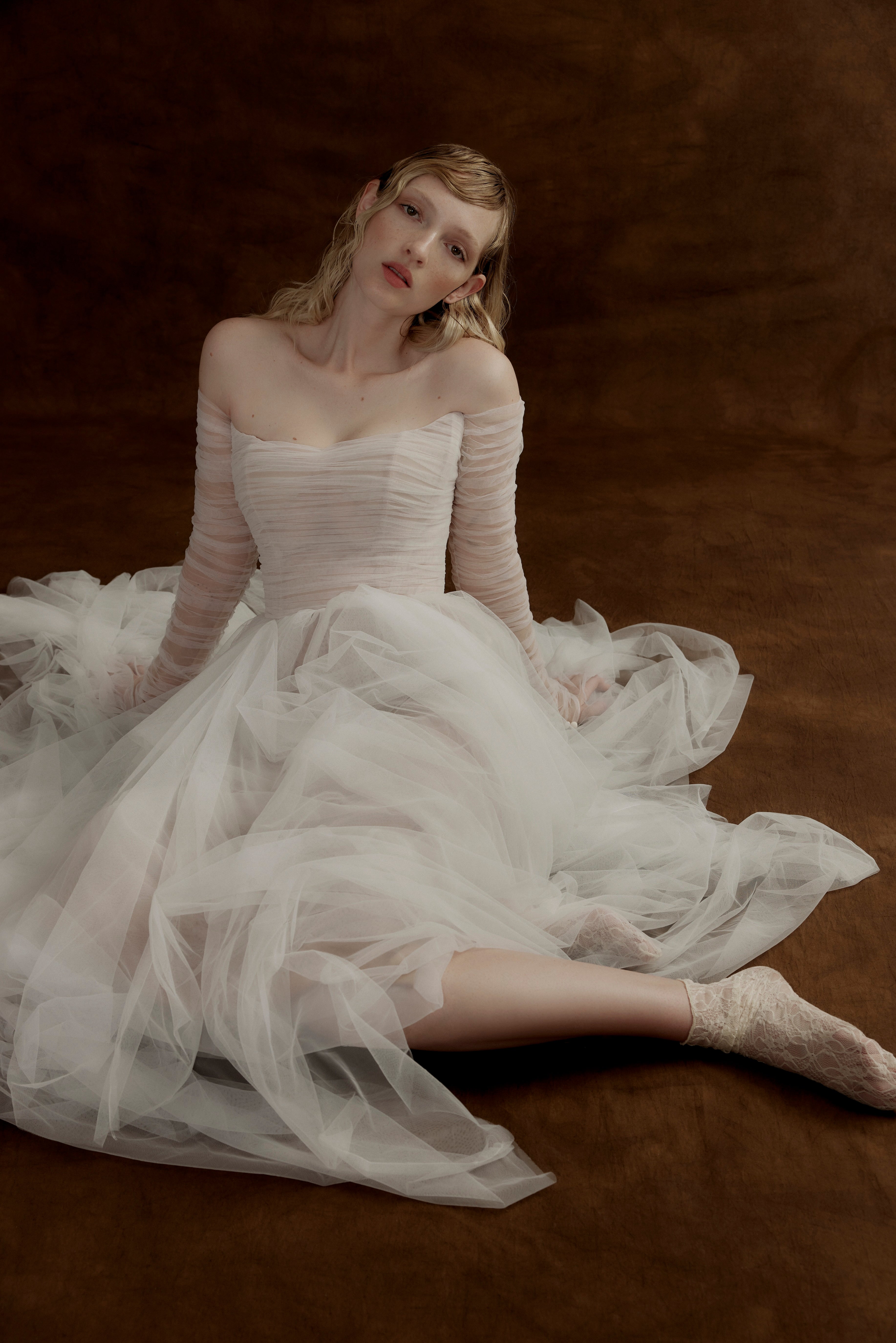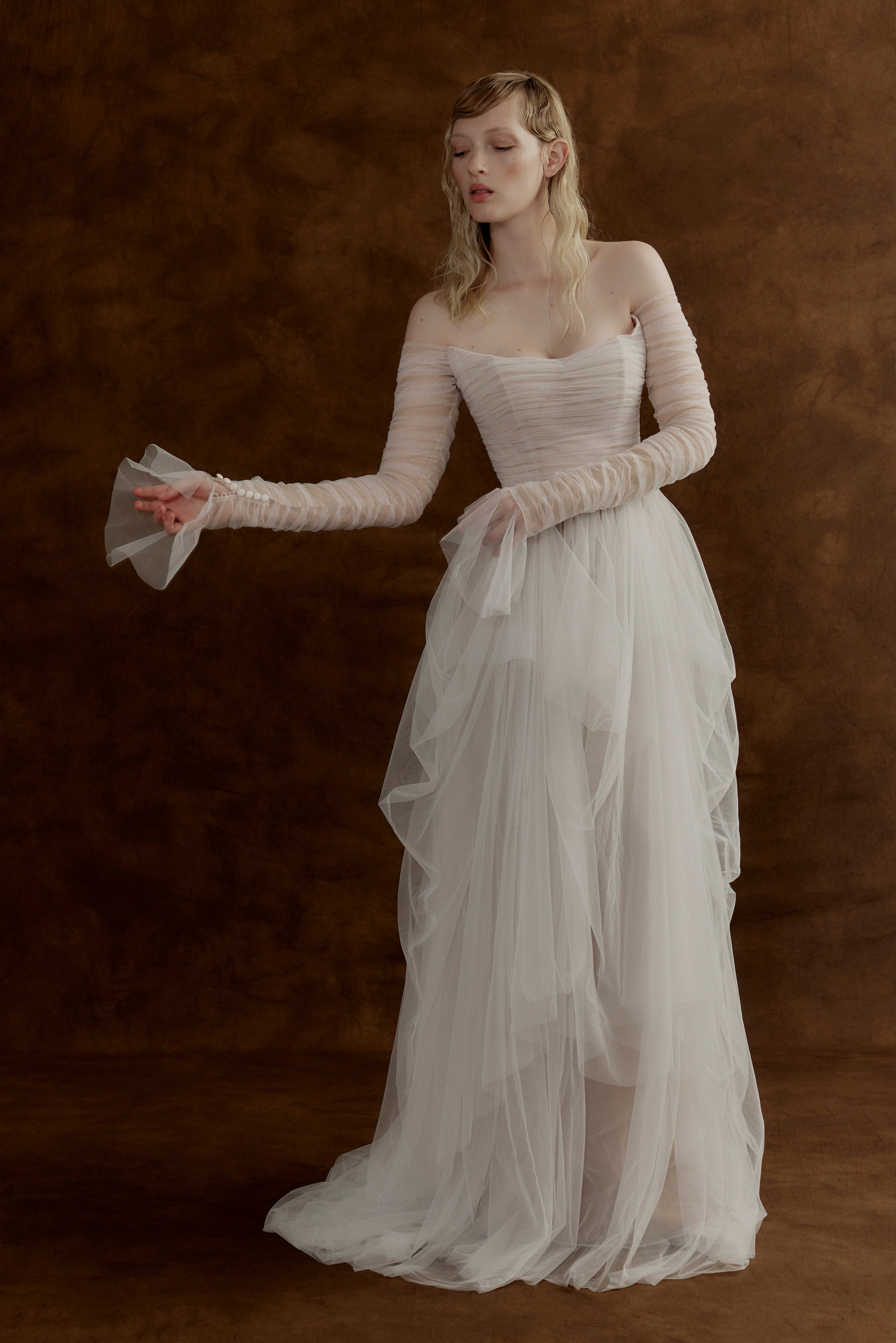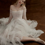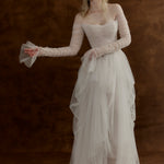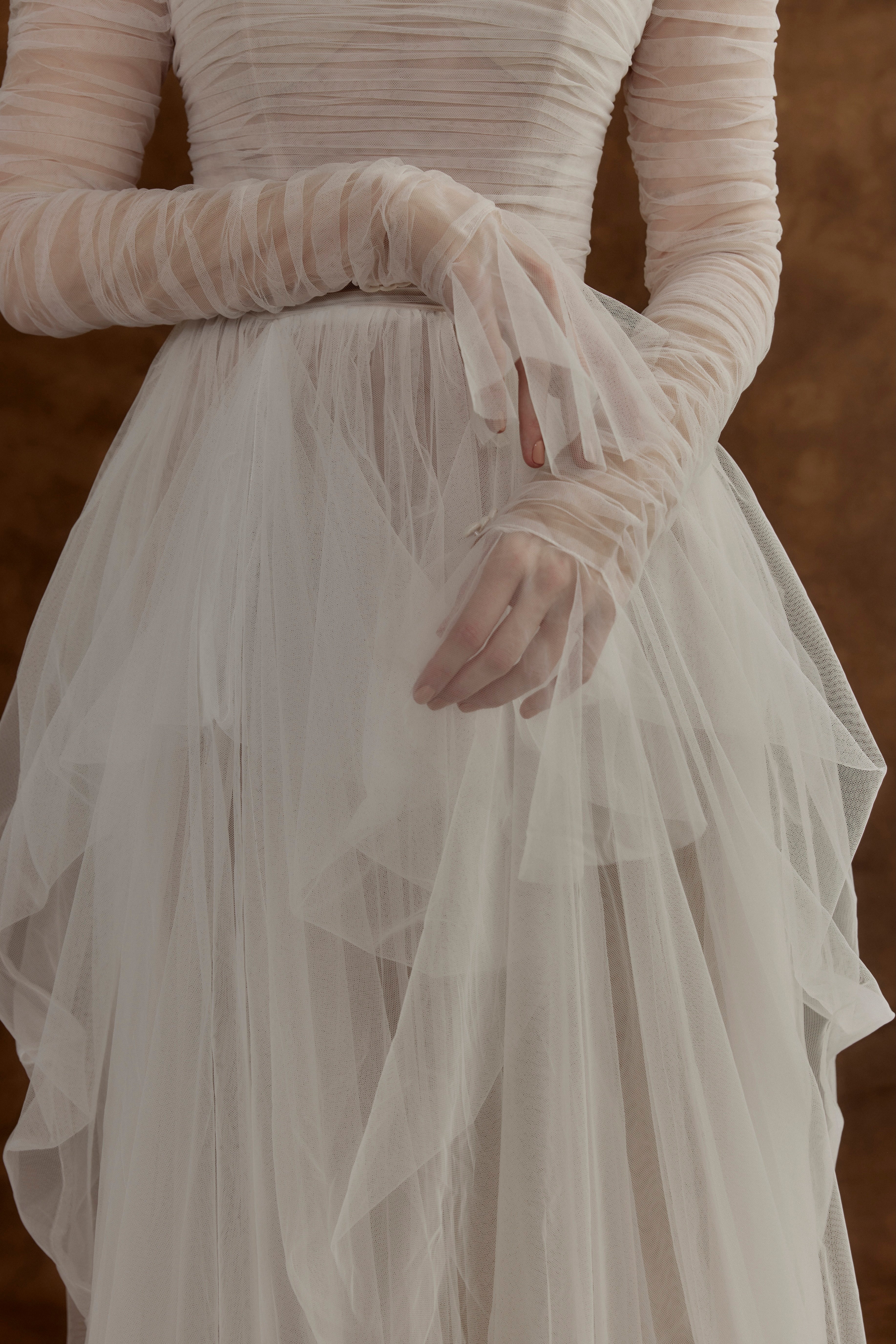 Soft hand-draped tulle over scoop-neckline corseted bodice paired with gathered tulle long off-shoulder long sleeve with a romantic flare-shaped hem. Abstract A-line tulle skirt with soft train at the back.