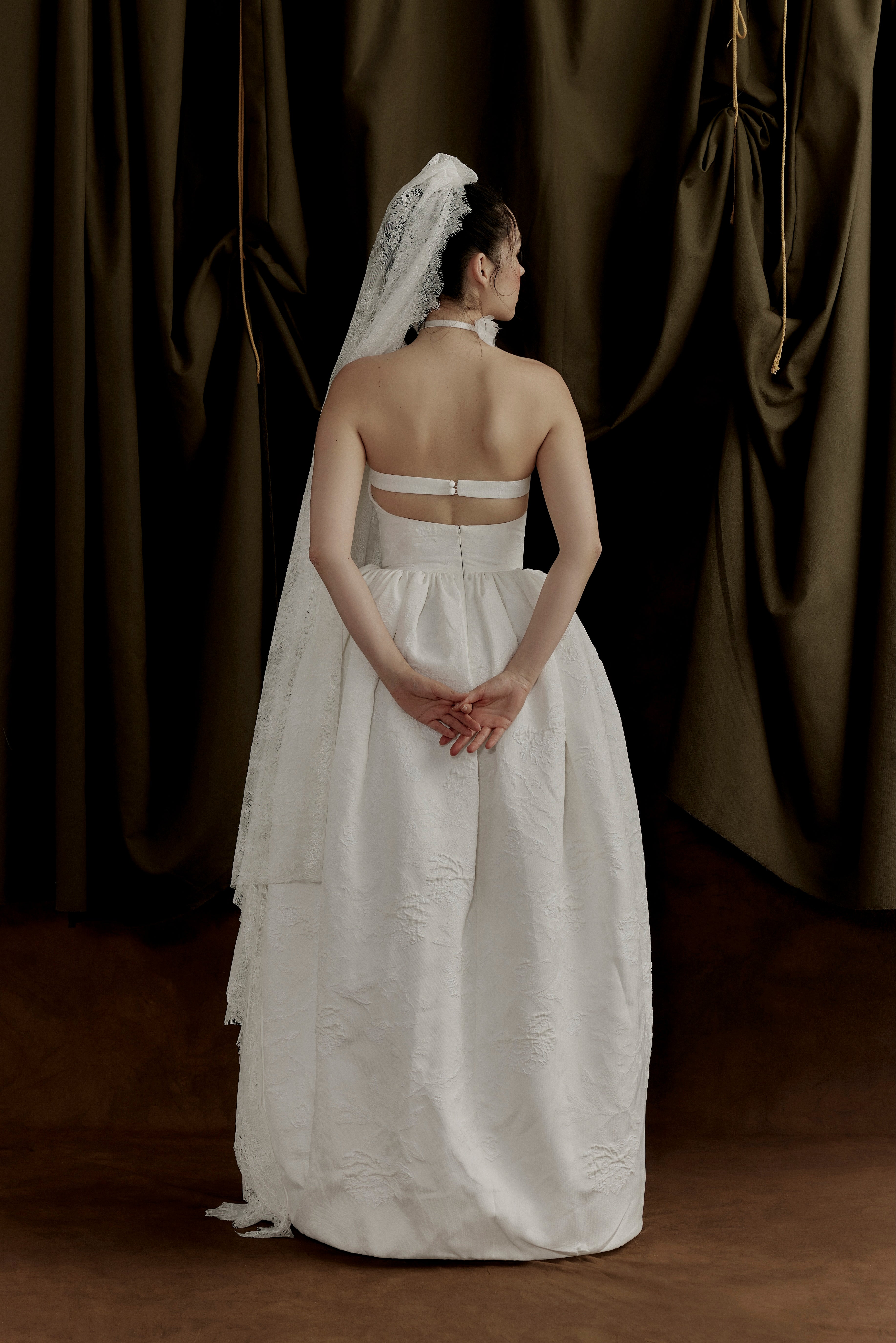 Jacquard floral embossed gown with straight-neckline paired with a Tulip-shaped skirt. Backless details with strap on back-neckline.