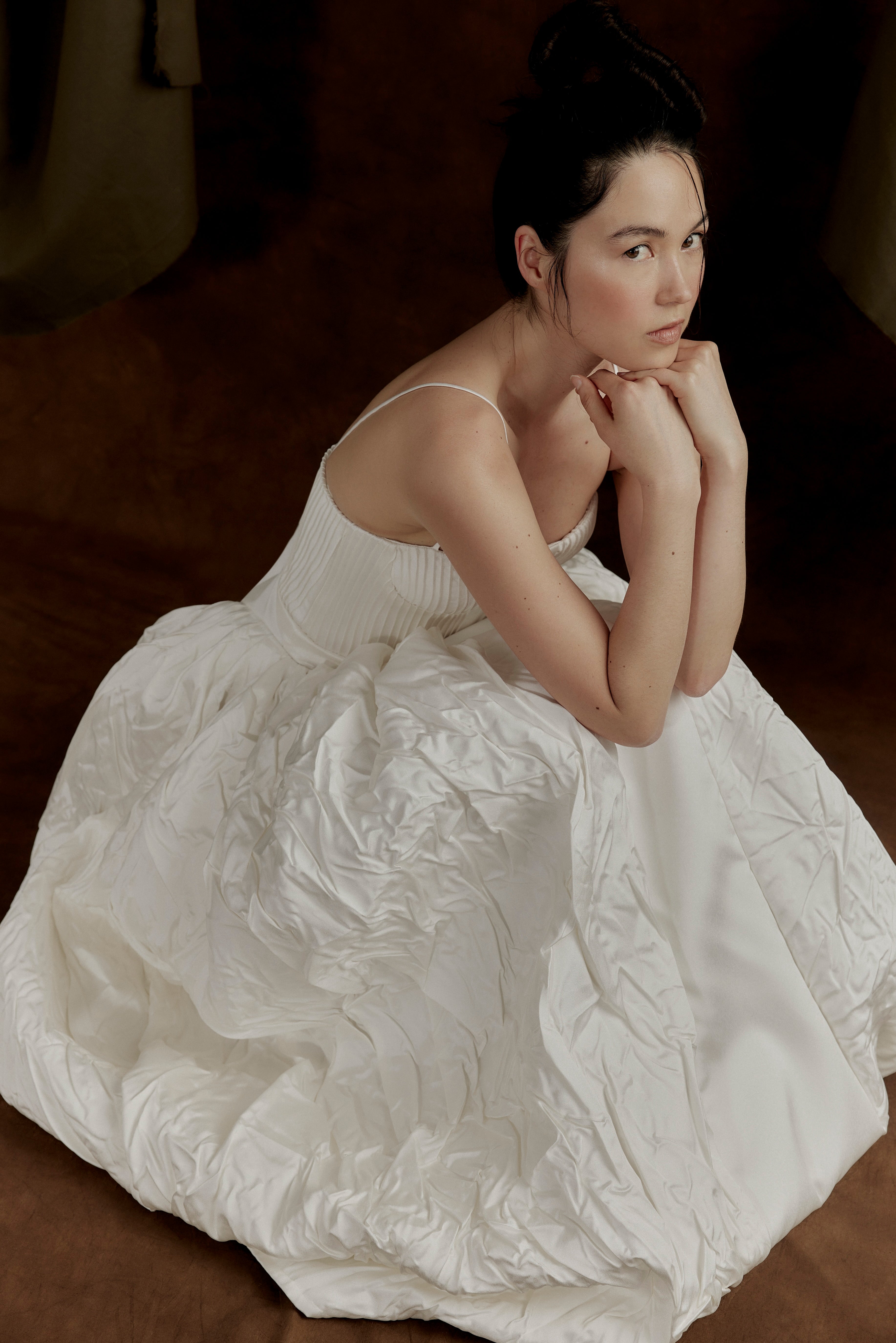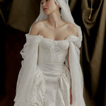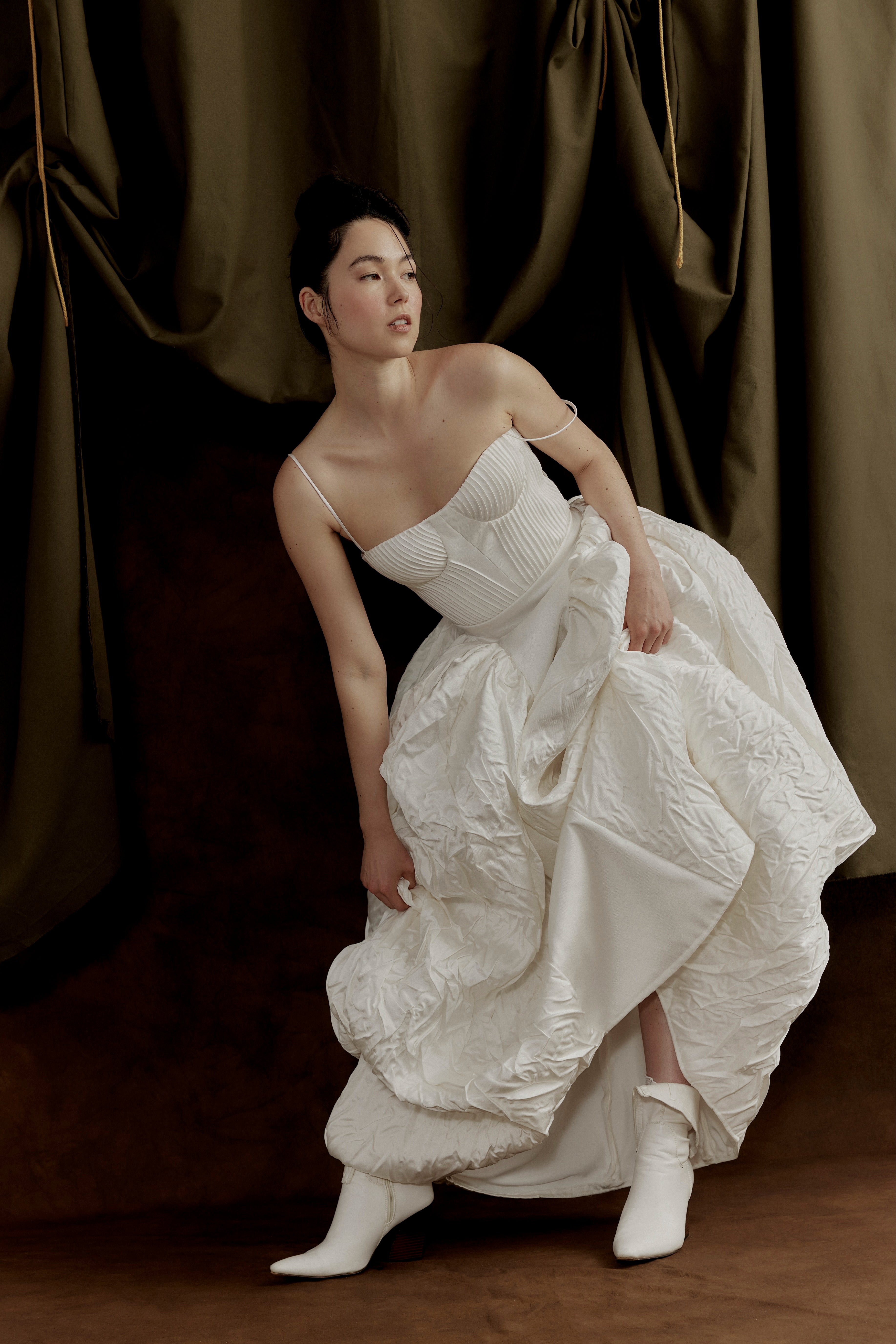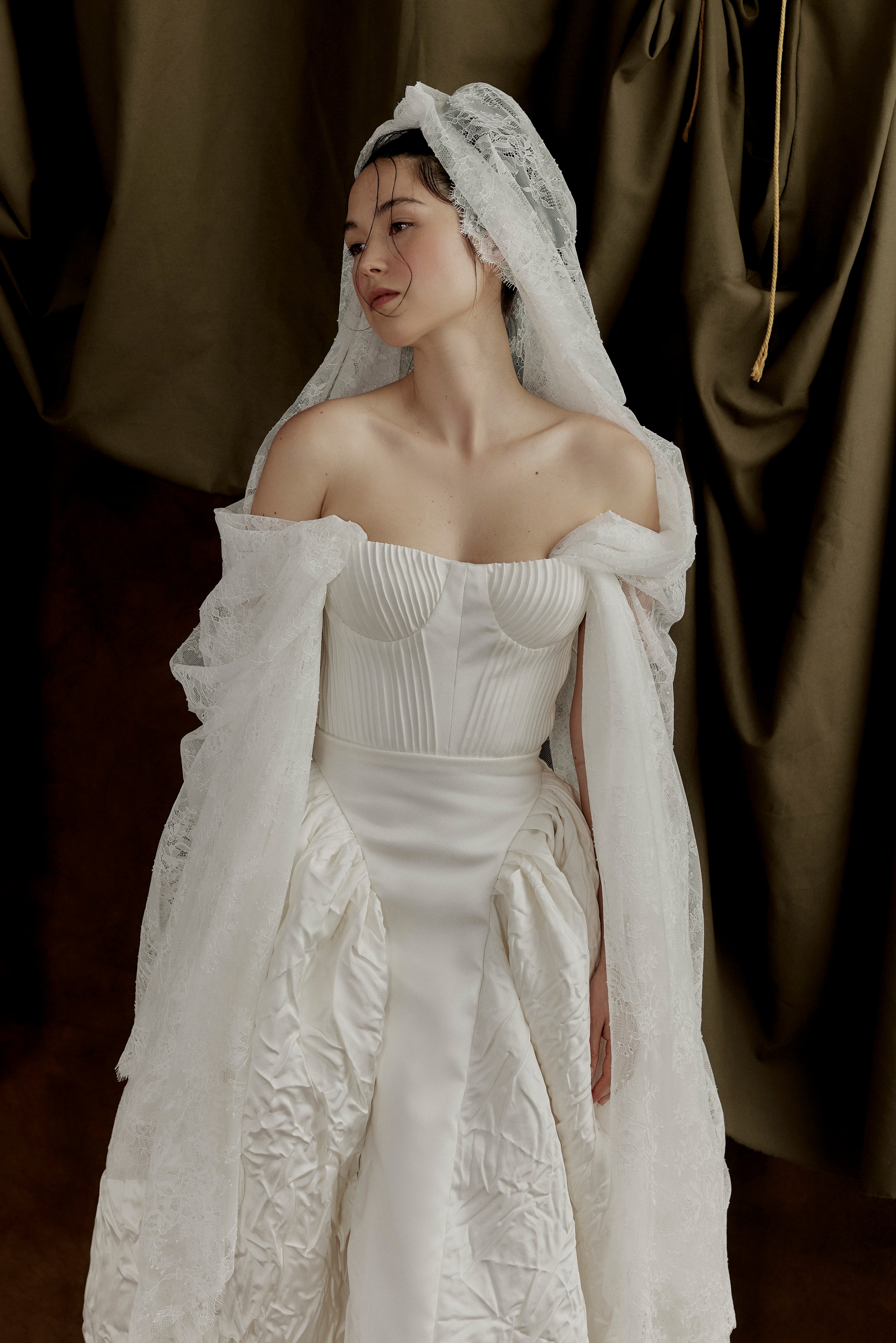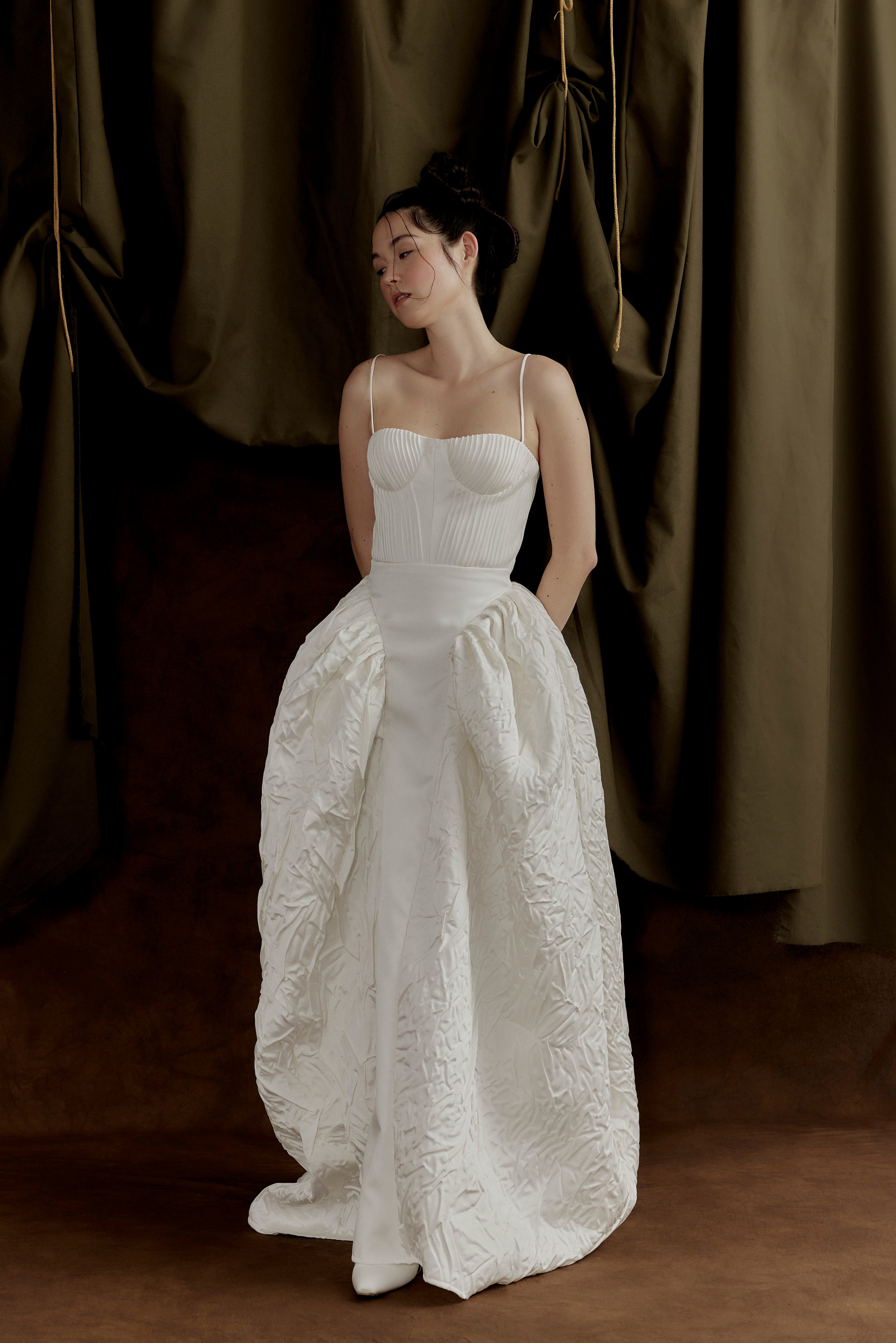 Featuring modern Elizabethan gown in Mikado with Micro-tucked details over corseted bodice & spider web-pleated details over the sophisticated pleated skirt.