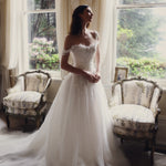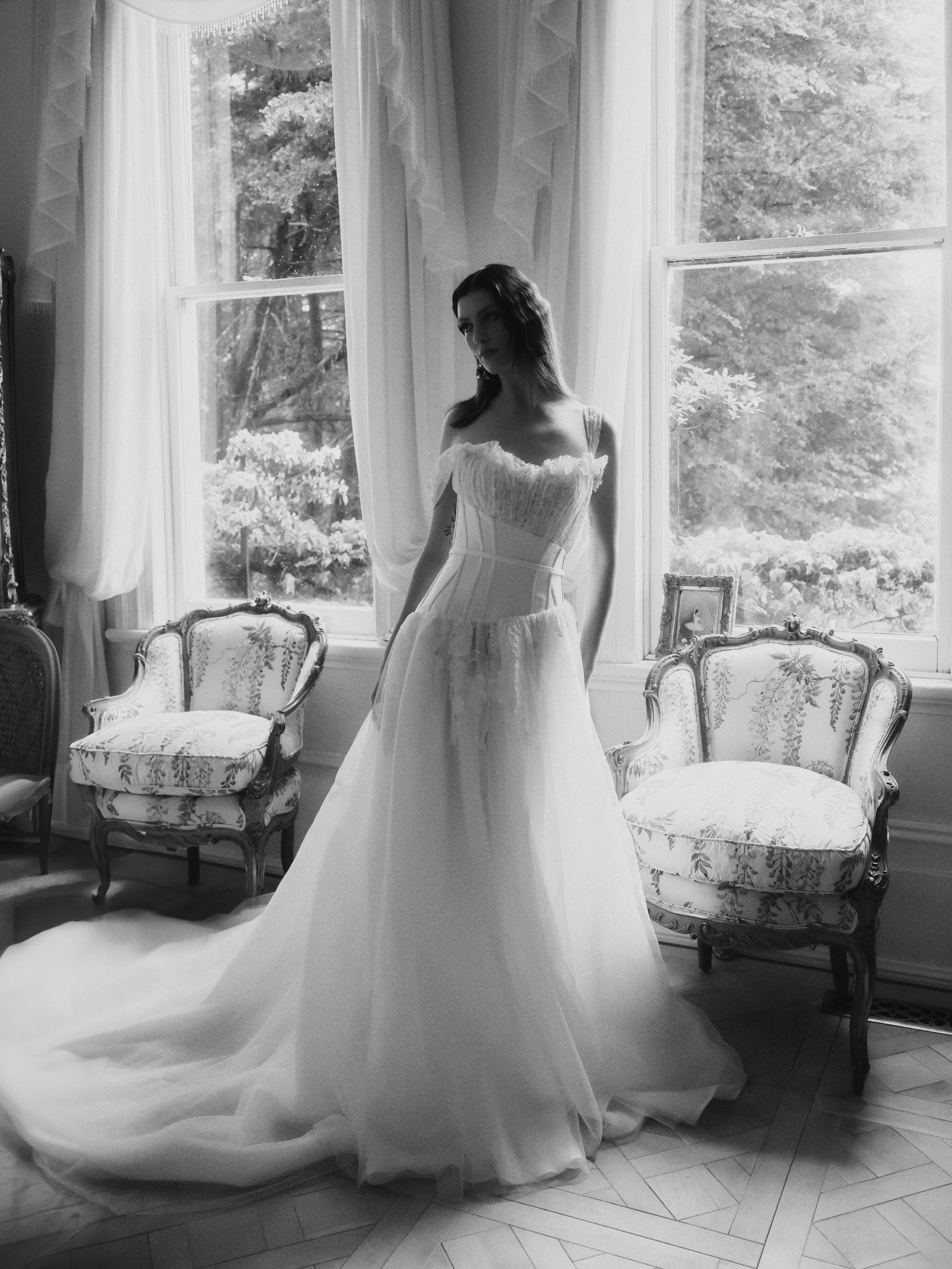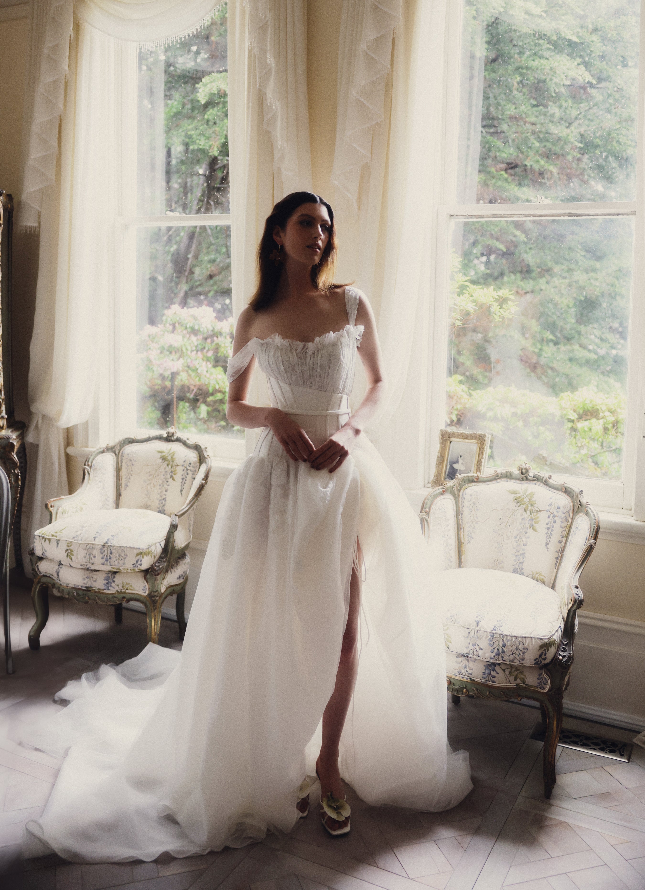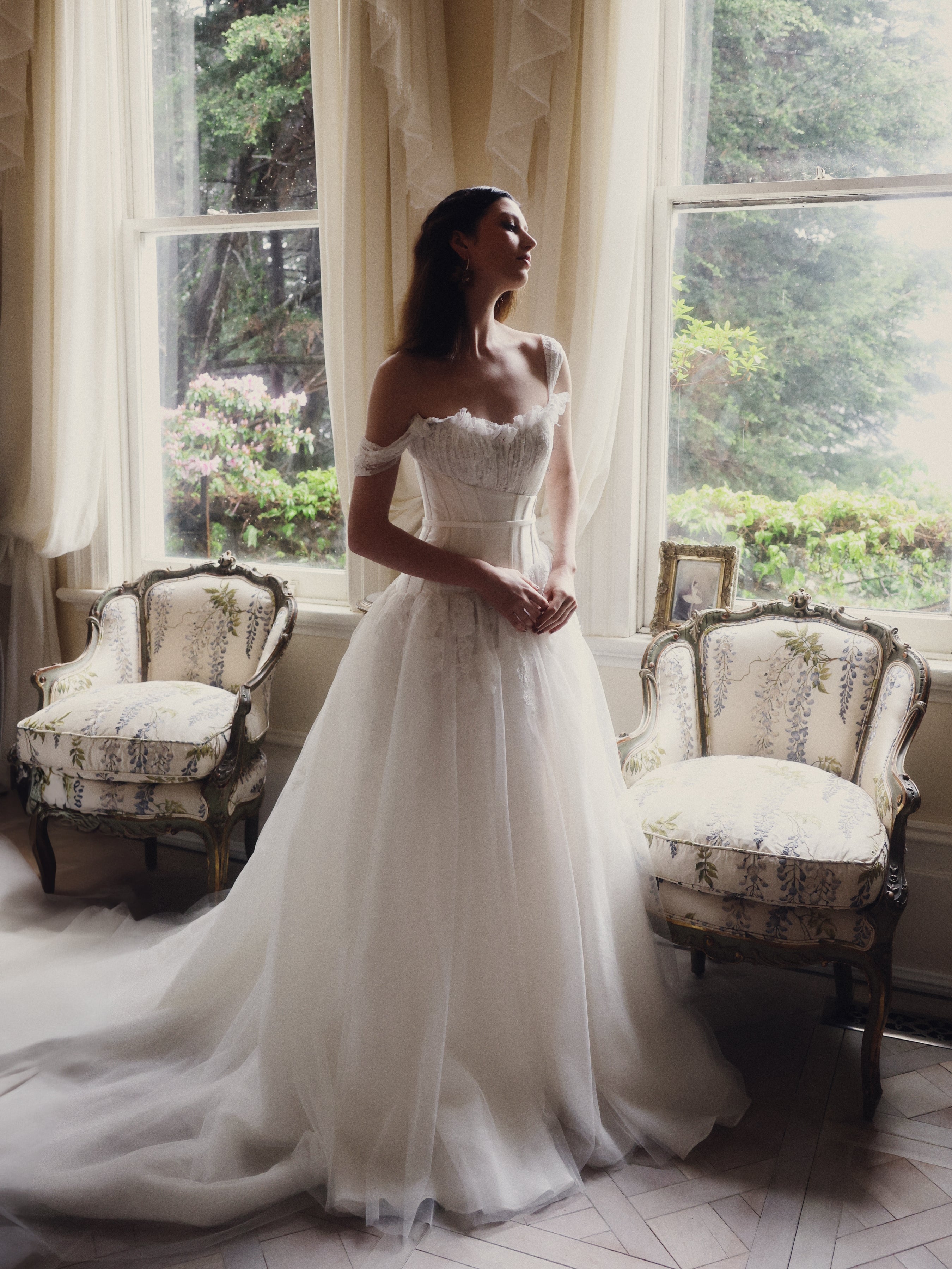 A soft scooped-neckline gown in hand-pleated Chantilly French lace, paired with an asymmetrical structured bodice in Mikado. A dropped waist soft tulle skirt with Chantilly appliqué.