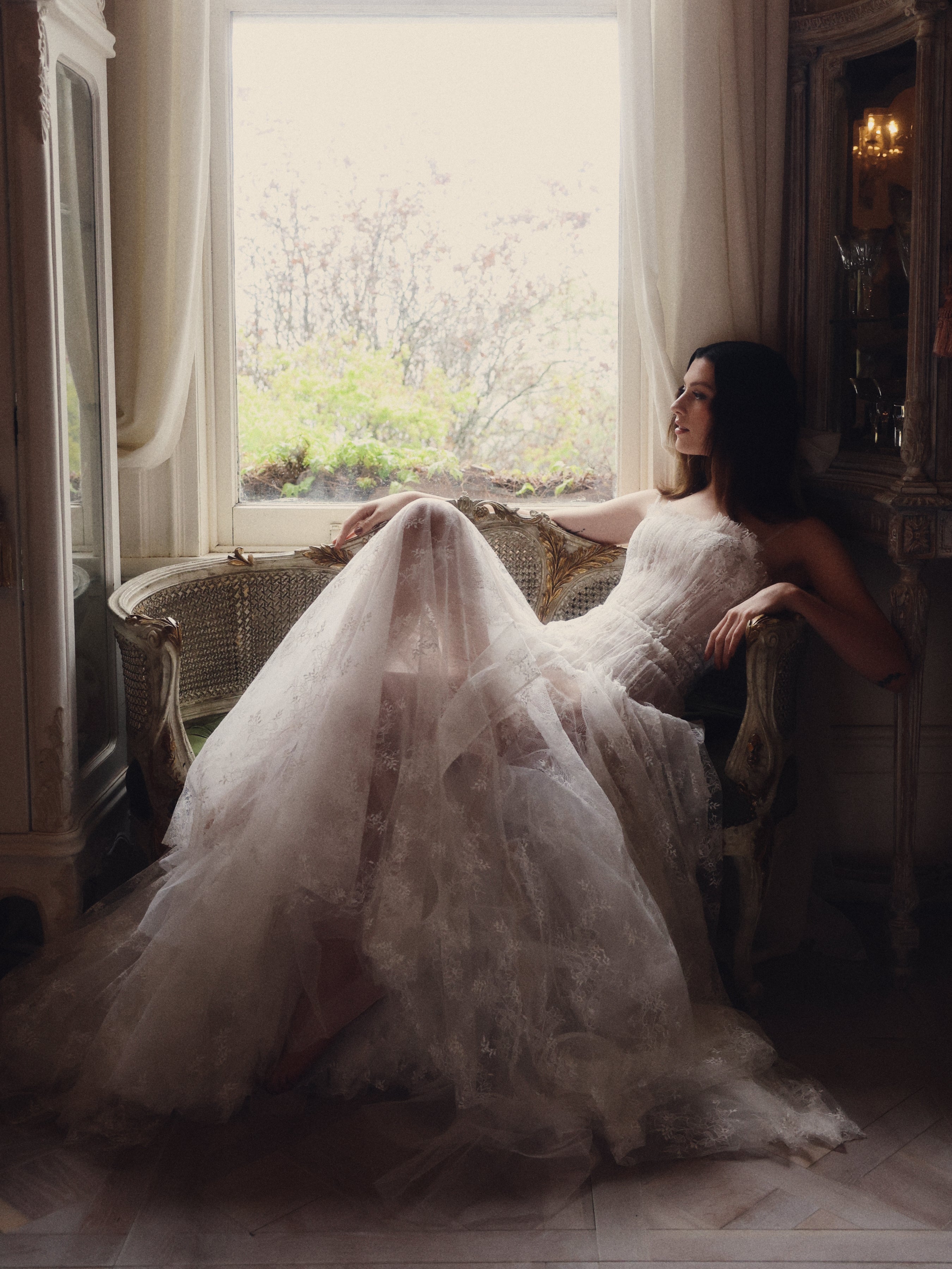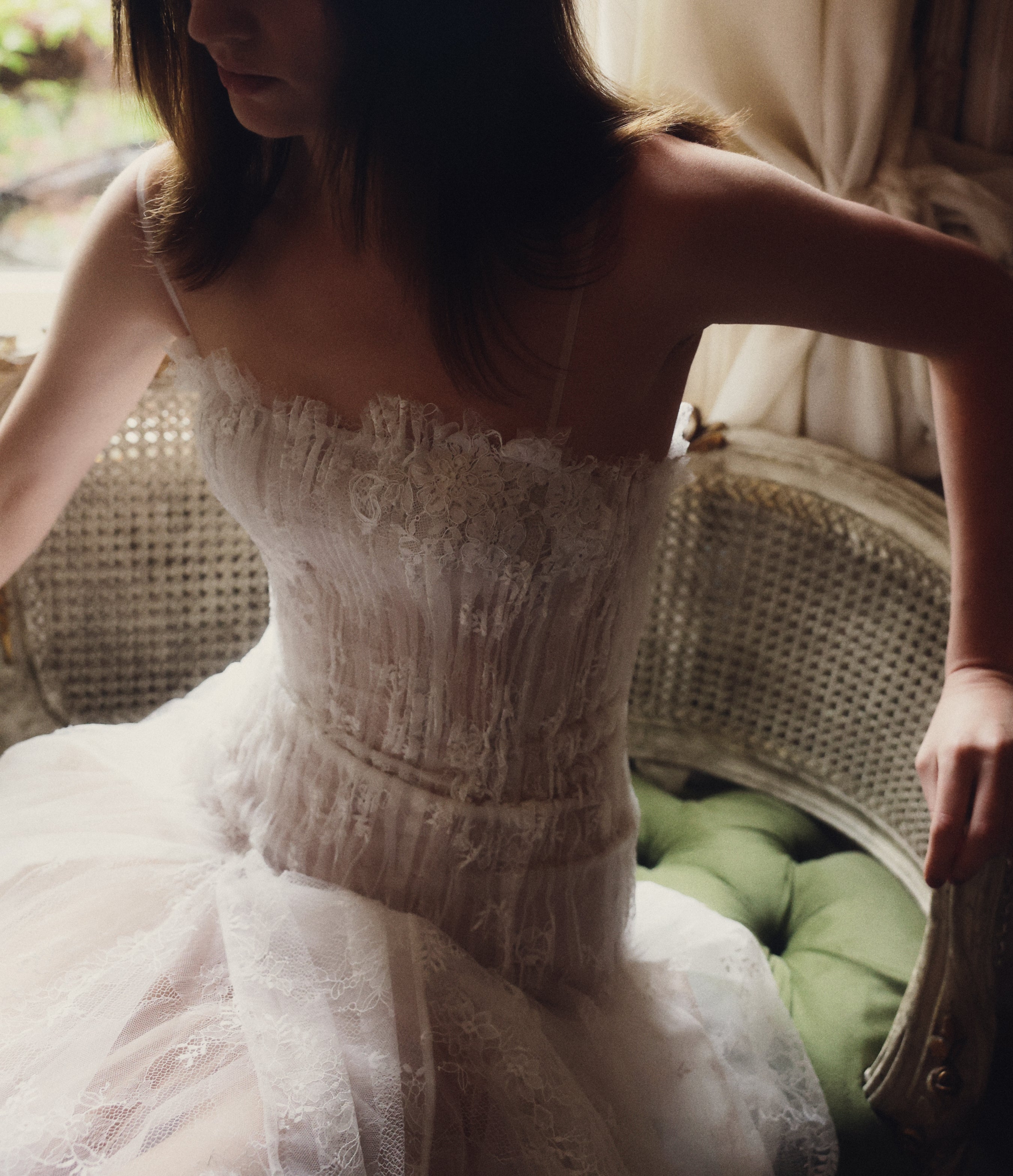 Soft tulle on a drop waist of a collapsed-look ballgown in Chantilly French lace. Featuring a pin-tucked stitched Chantilly over corseted bodice.