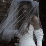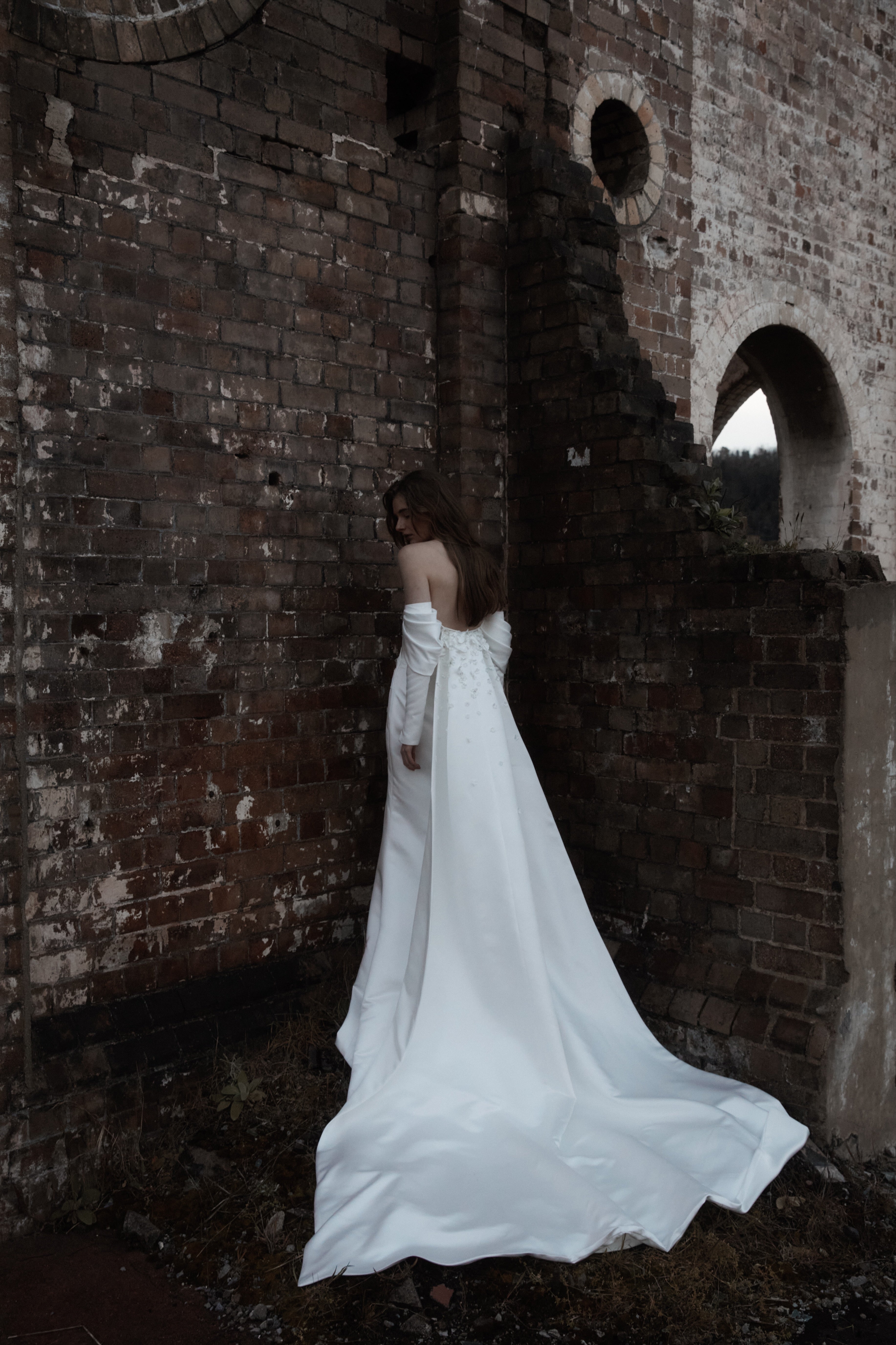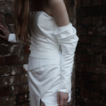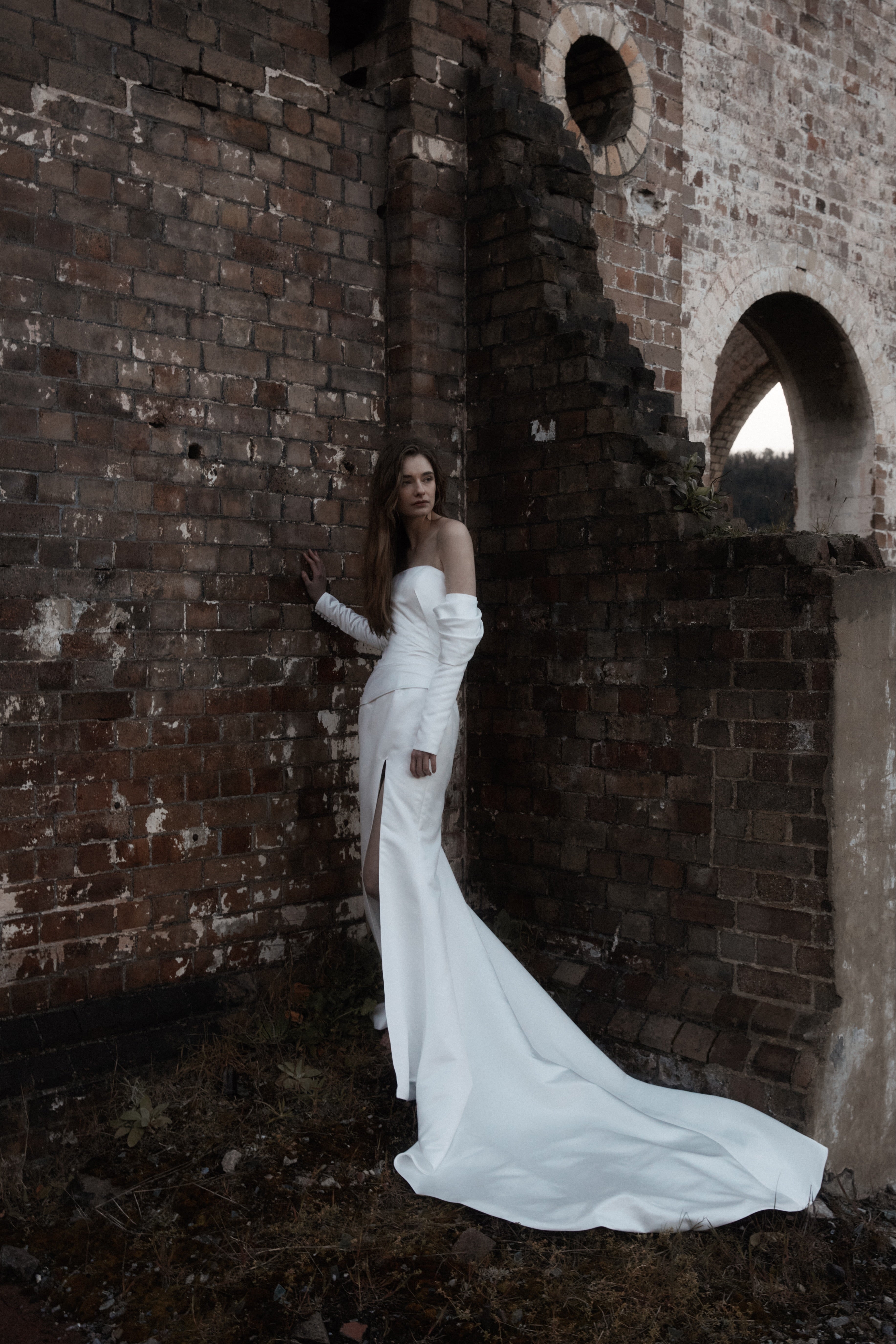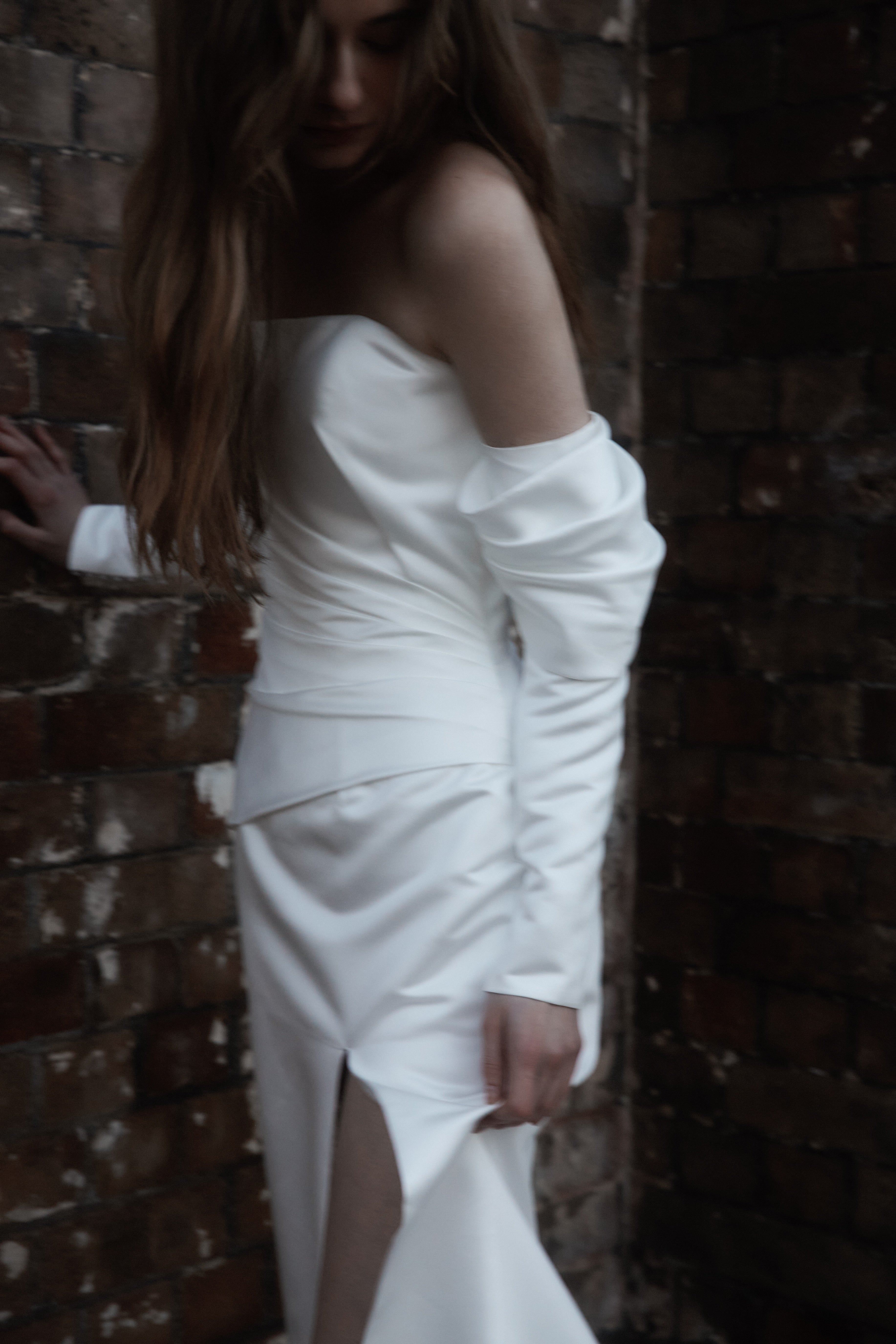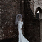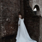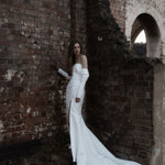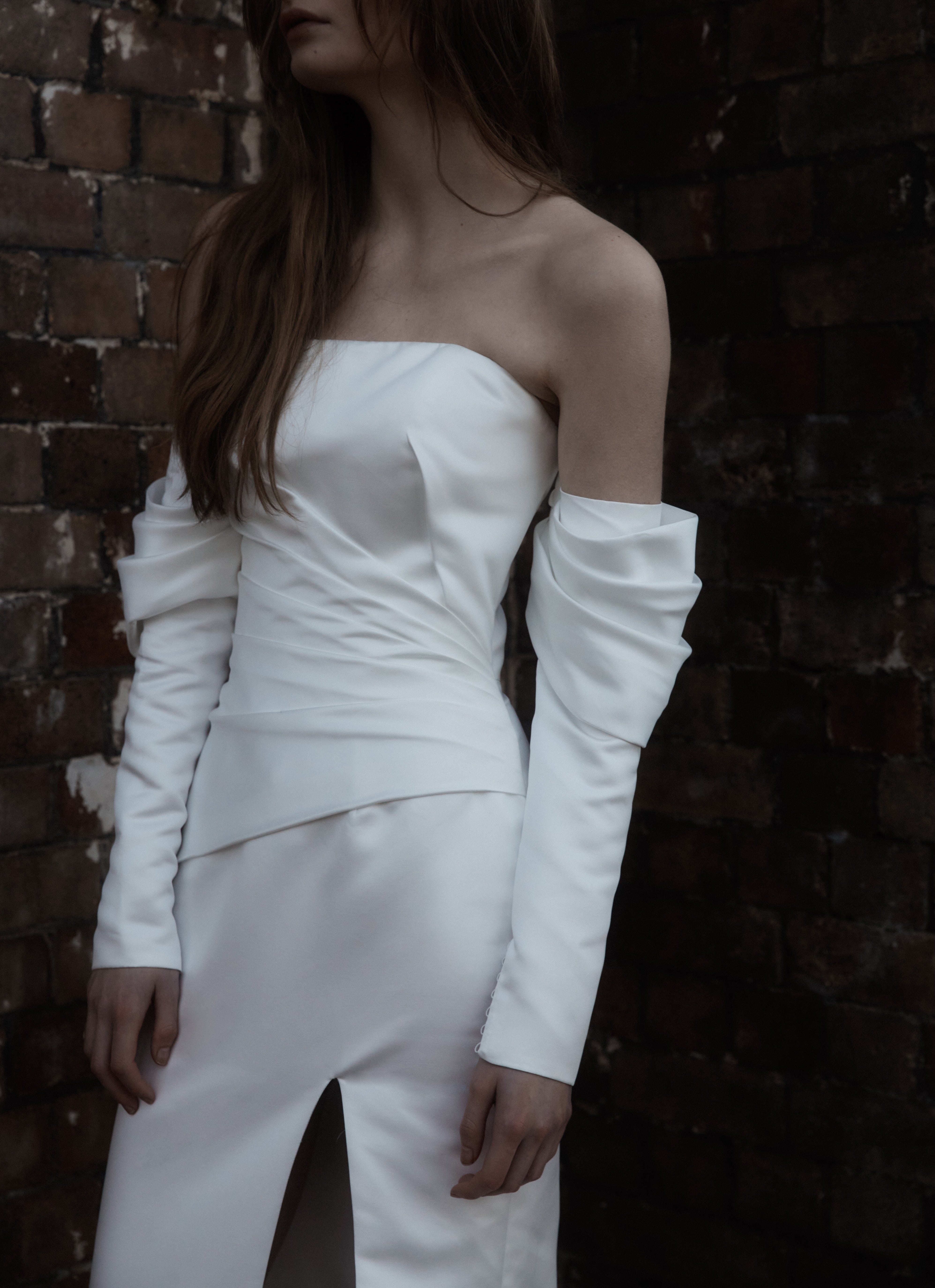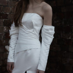A statement modern gown, Claude features asymmetrical draped bodice in duchess satin with a straight neckline and a split on skirt, pairs with a uniquely detachable draped sleeves giving an editorial high fashion look.
