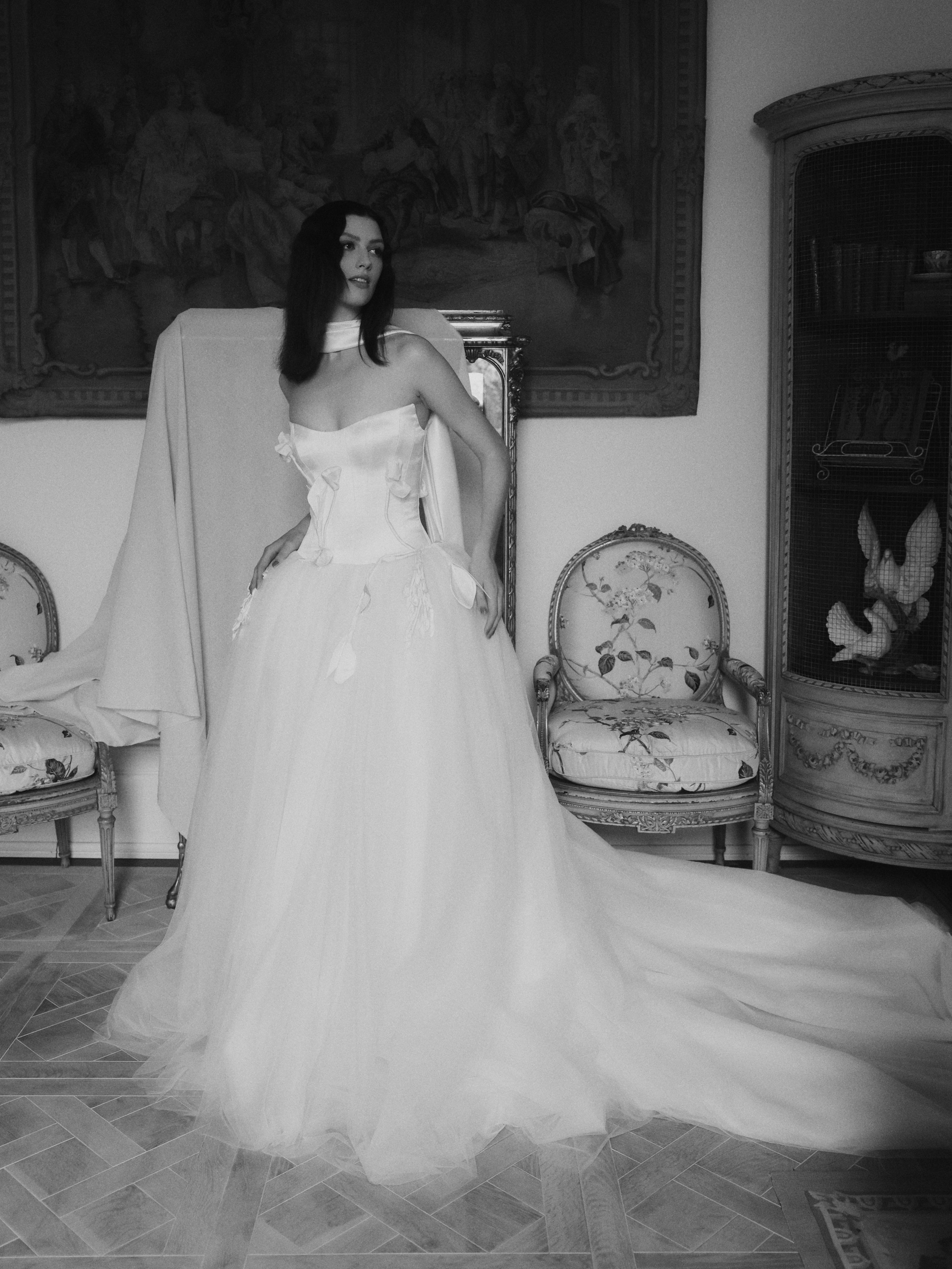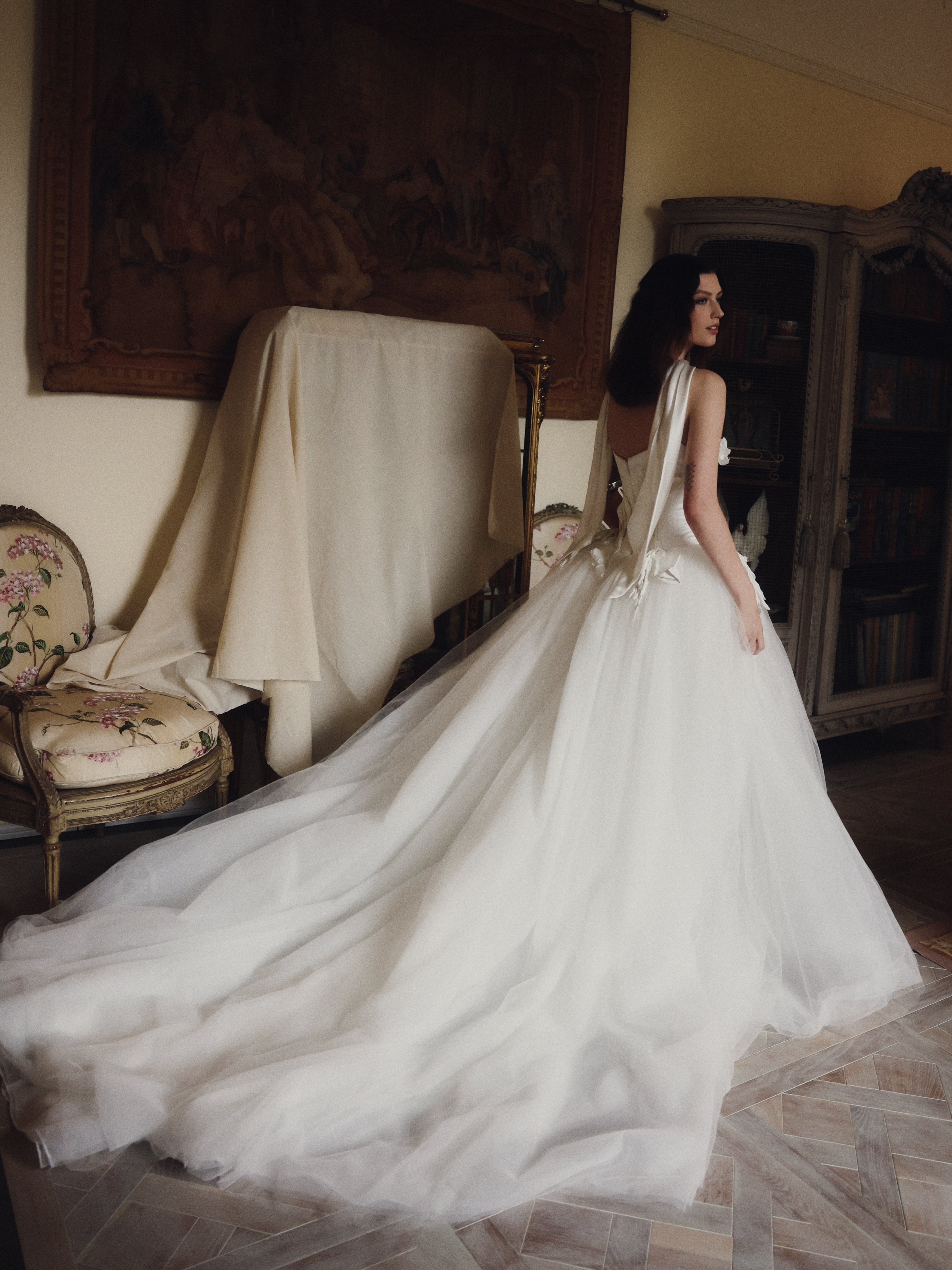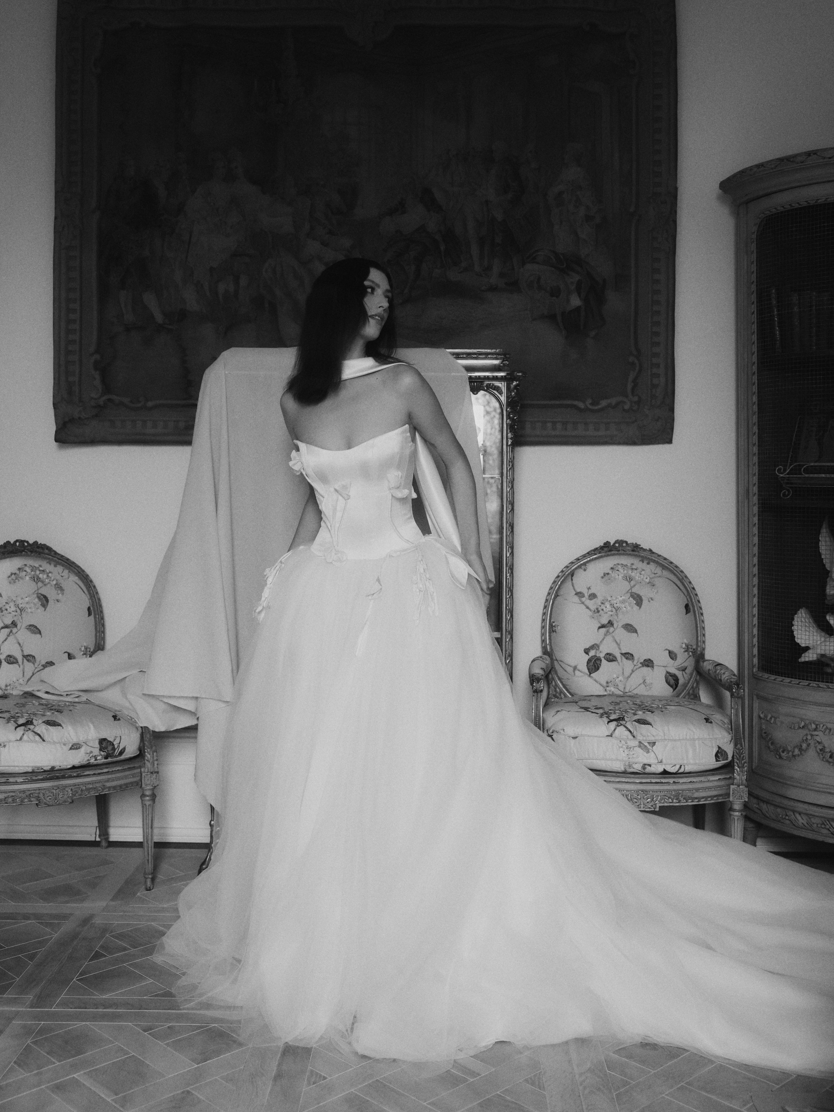 A voluminous soft tulle skirt with 2 meters length train from the waist to the back.
