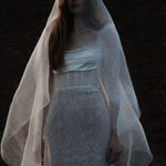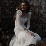 A semi sheer corseted bodice in delicate Chantilly French lace finished with hand-draped duchess satin and slight puff long sleeves as a touch of modernity on a classic gown. The low back features 2 asymmetrical silk satin straps and finish with scallop edge Chantilly lace.