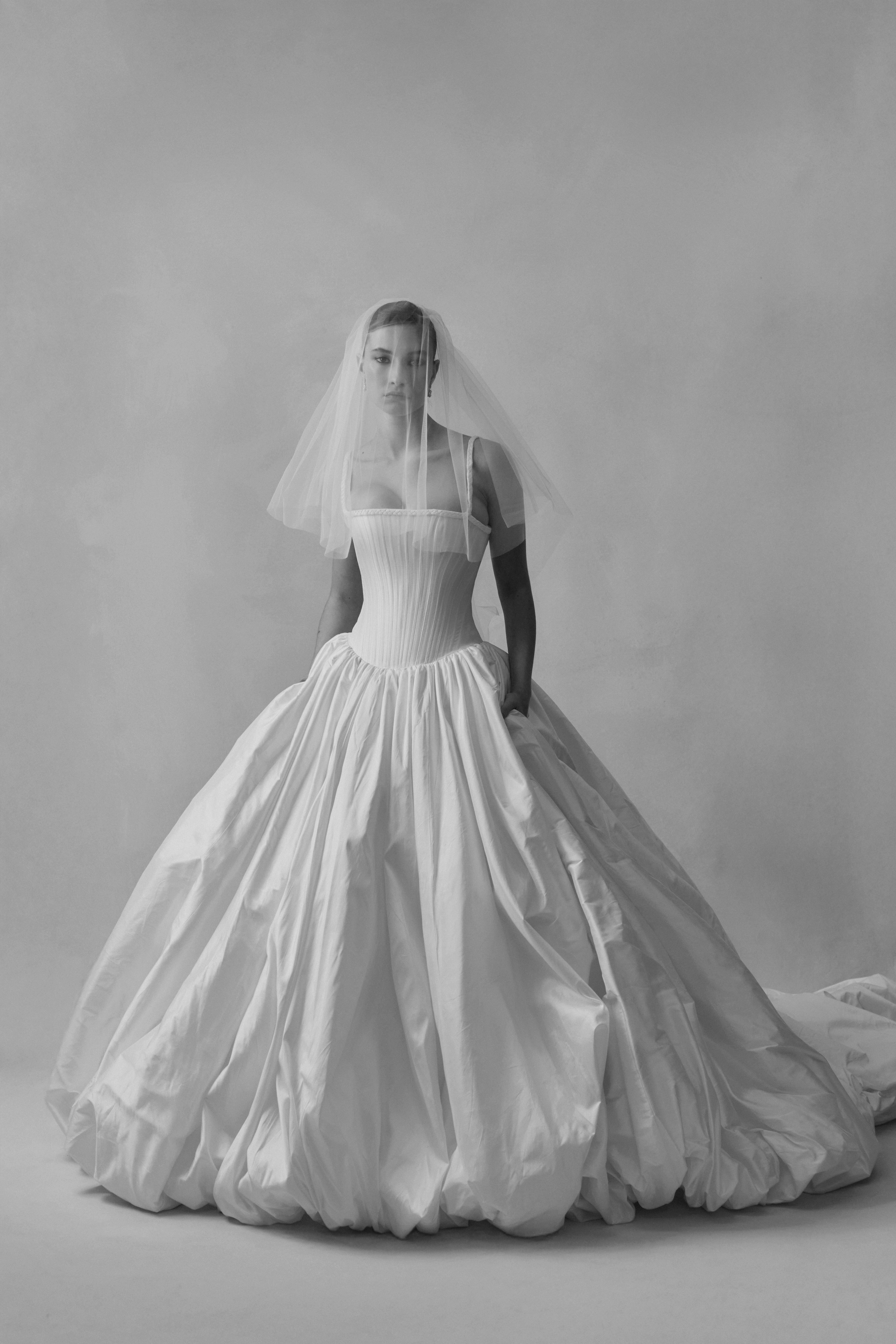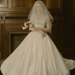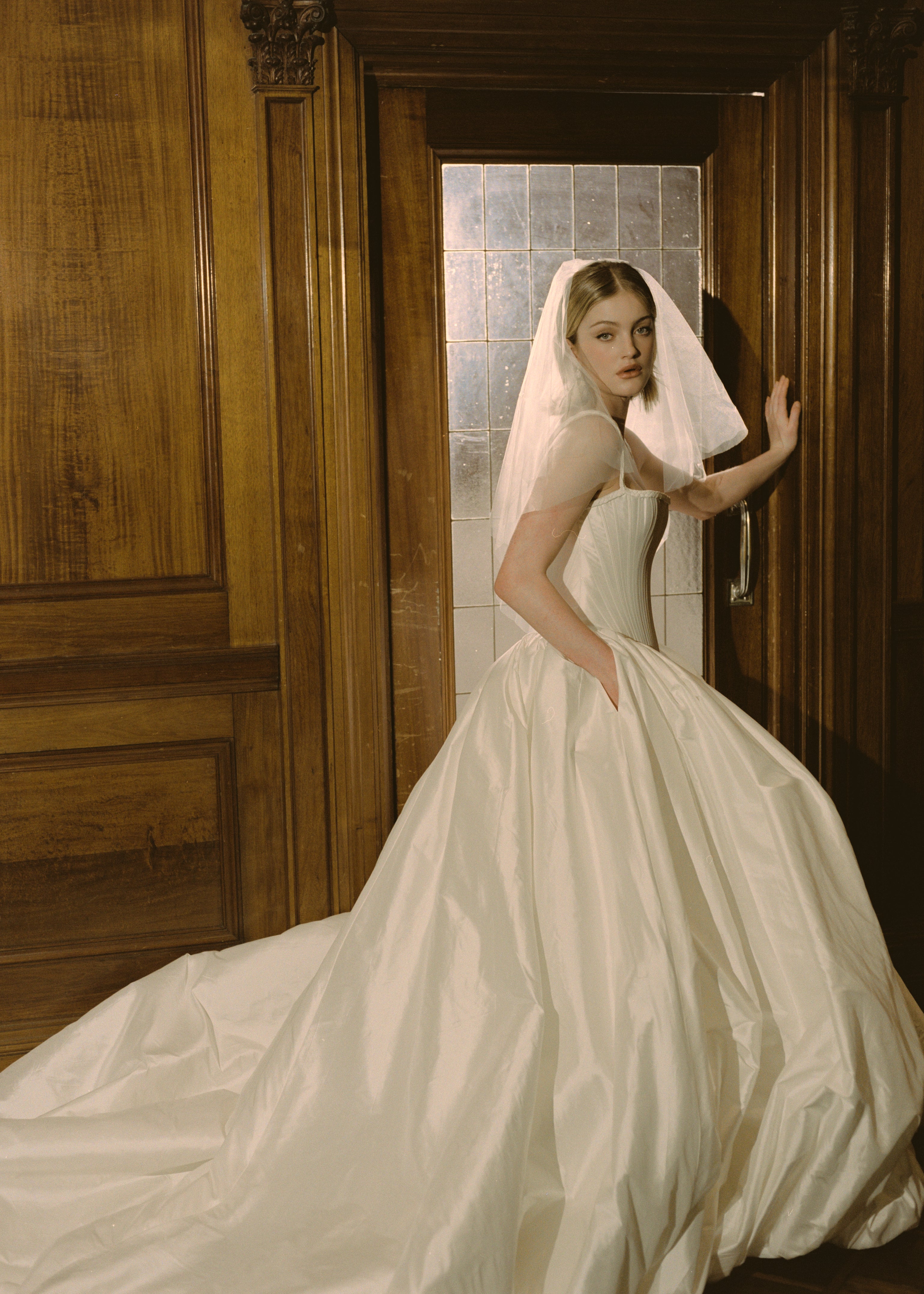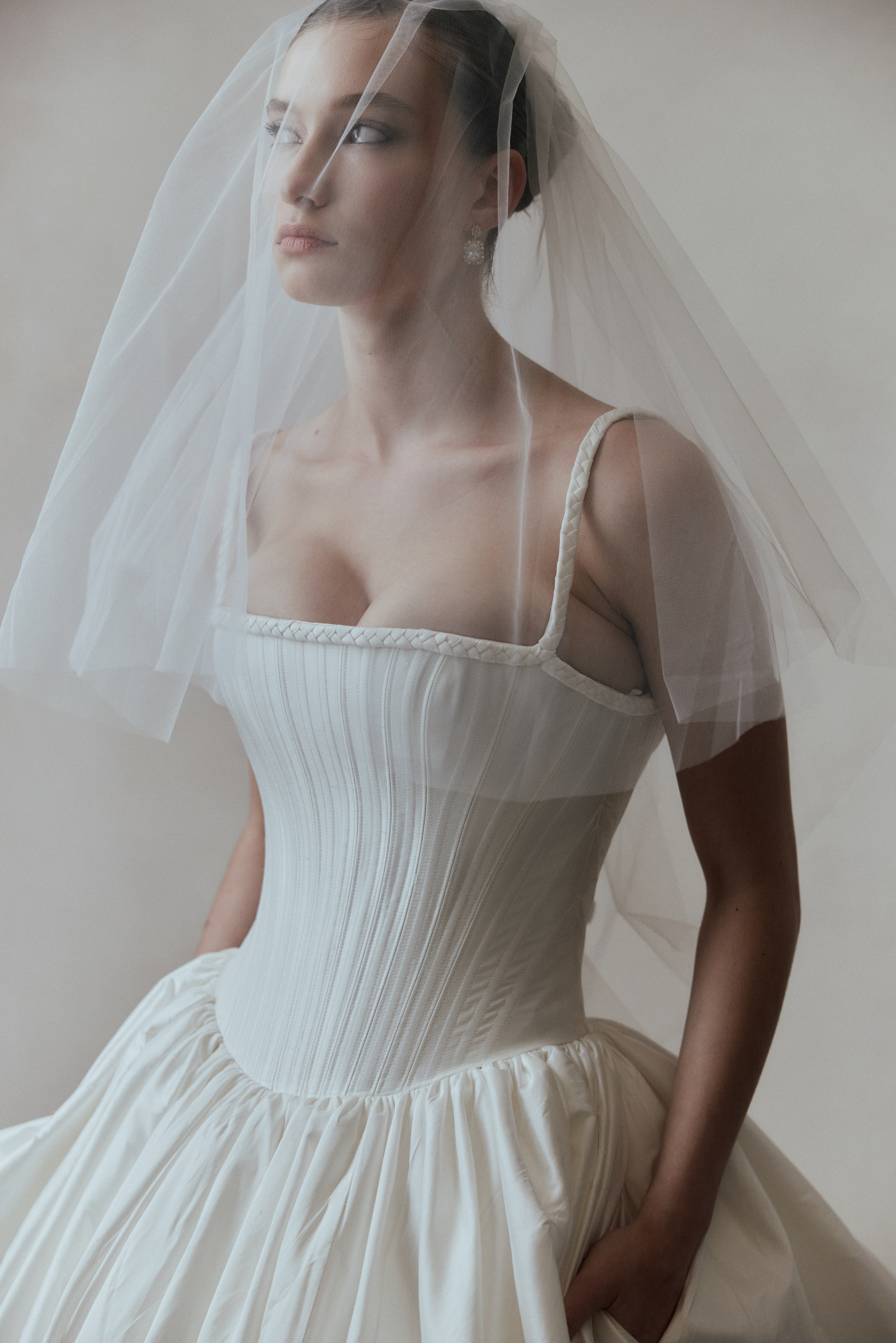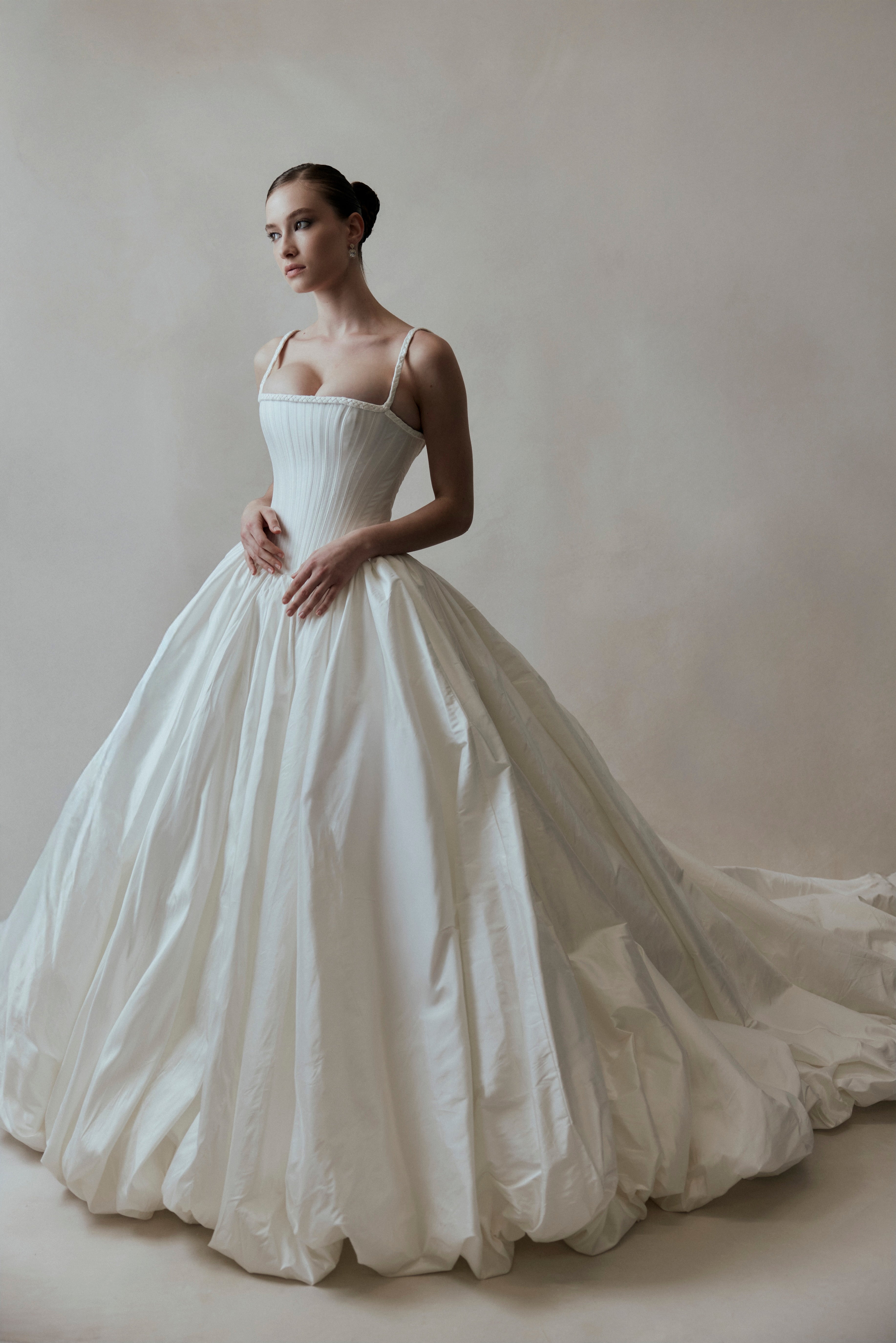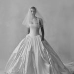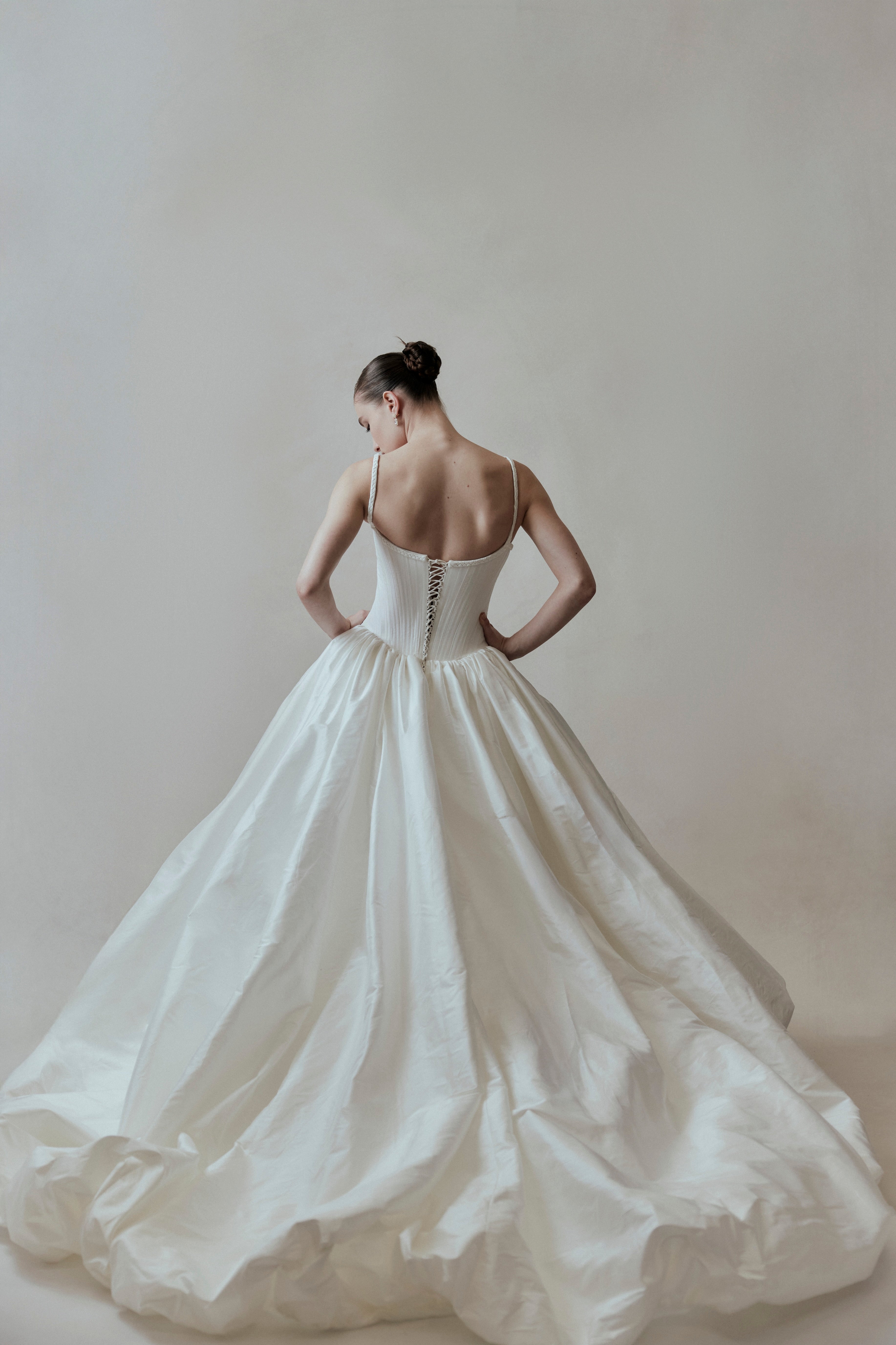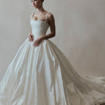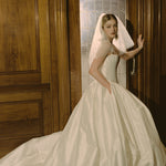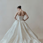 Strapless dropped waisted silk dupion ballgown with 34 bonings panelling detail. Structured bodice with an internal grosgrain belt, corded braid detail frames square neckline. Double circle skirt and train, with gathered waistline and petticoat for exaggerated volume. Invisible zip closure at centre back.