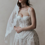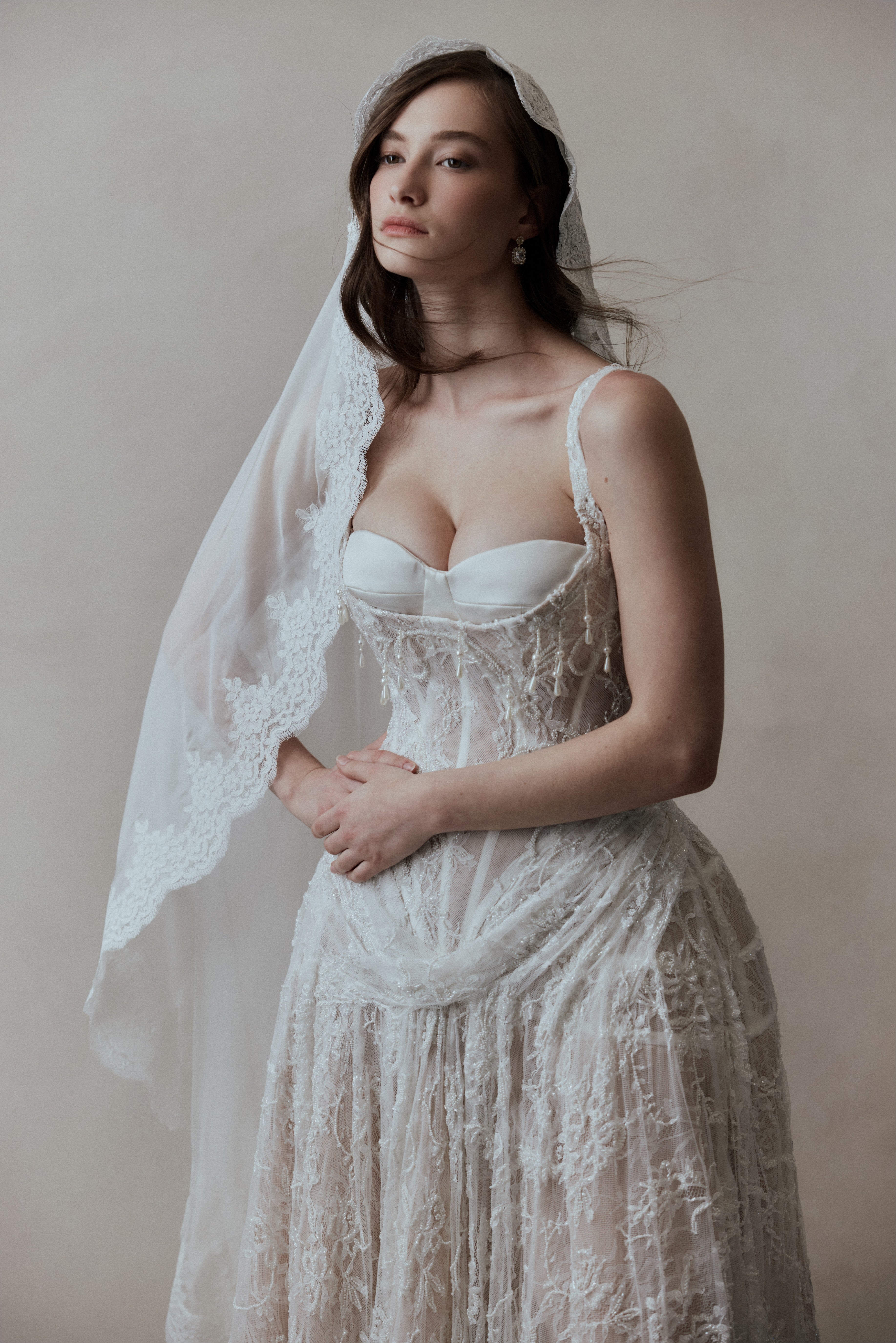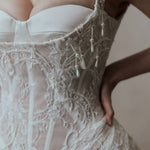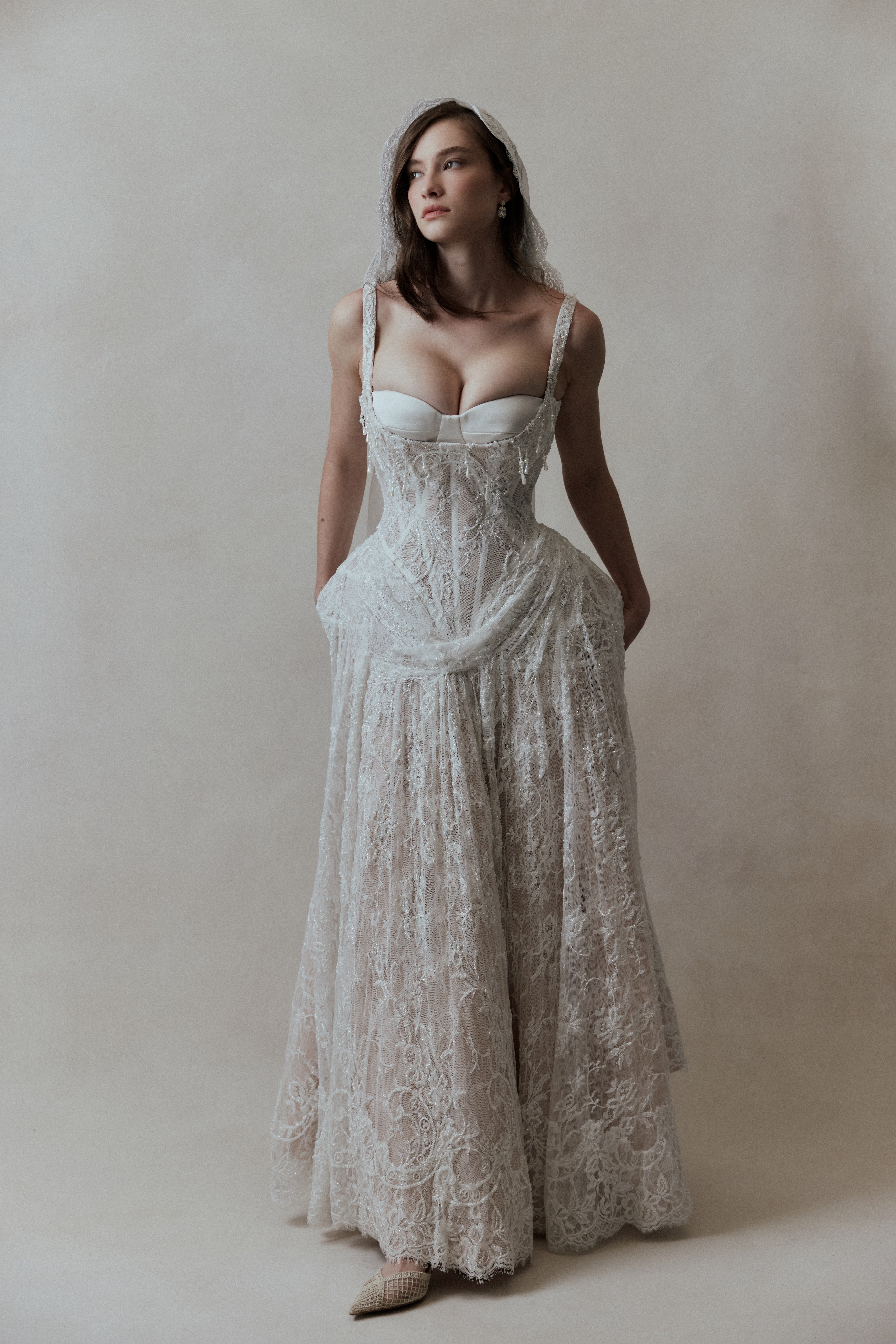 Re-imagine the rococo era of collapsed ball gown with 2 layered neckline details. Gown is hand-beaded with 2 layers of chantilly lace, pairs with hand-beaded dangle pearls. Features a low back neckline. Boned with hip cage for exaggerated hip look and a cinch in waist. Finish with the scallops lace details on the hem and back neckline.
