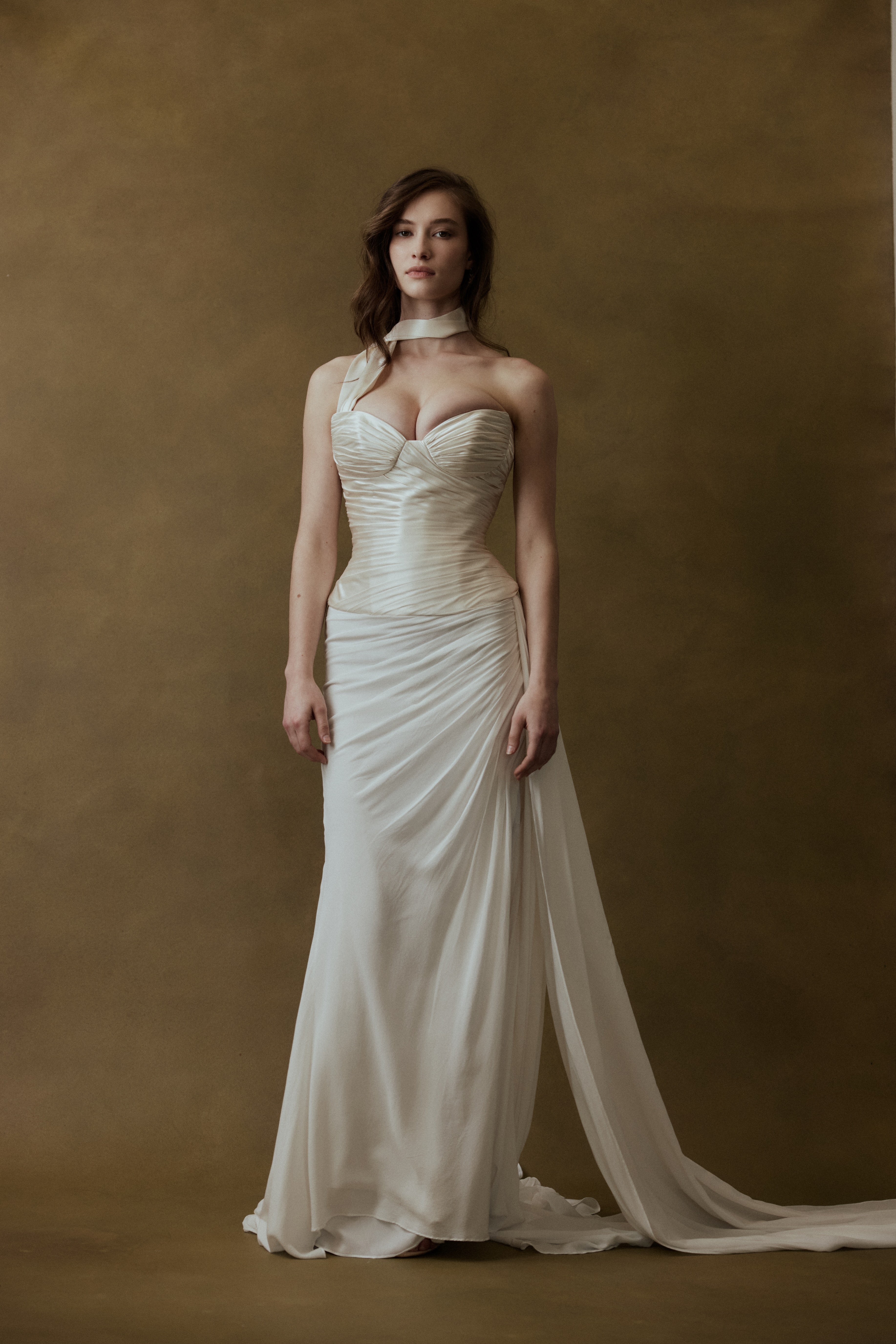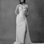 Two-piece ensemble detailed with ethereal asymmetrical cascade draping. Crepe satin micro pleating draped across the bodice, with structured internal boning and exaggerated hip detail, fastened with open end zipper. Silk chiffon draped skirt featuring side leg split and puddle train. Invisible zip closure at centre back skirt.