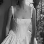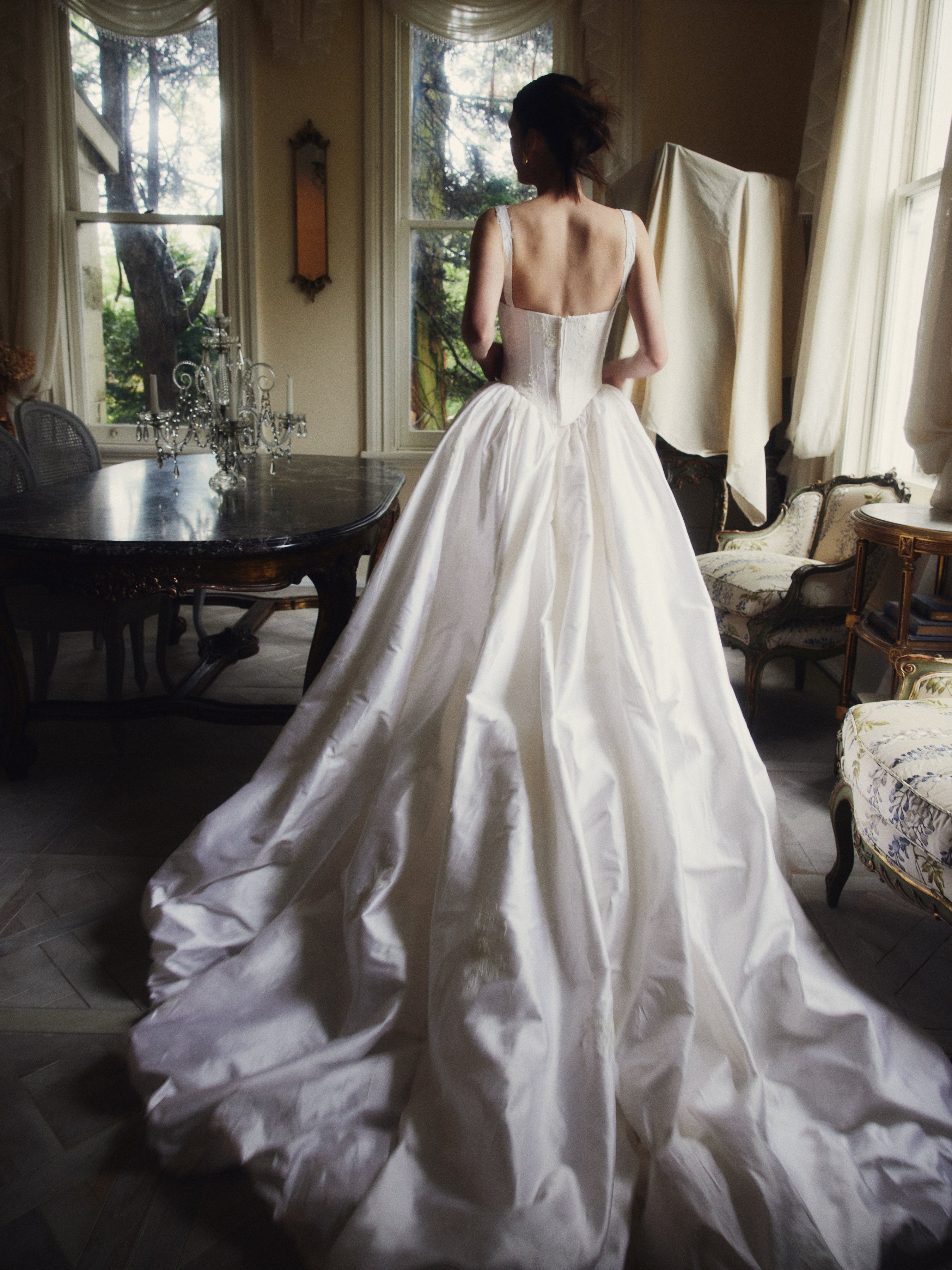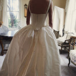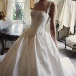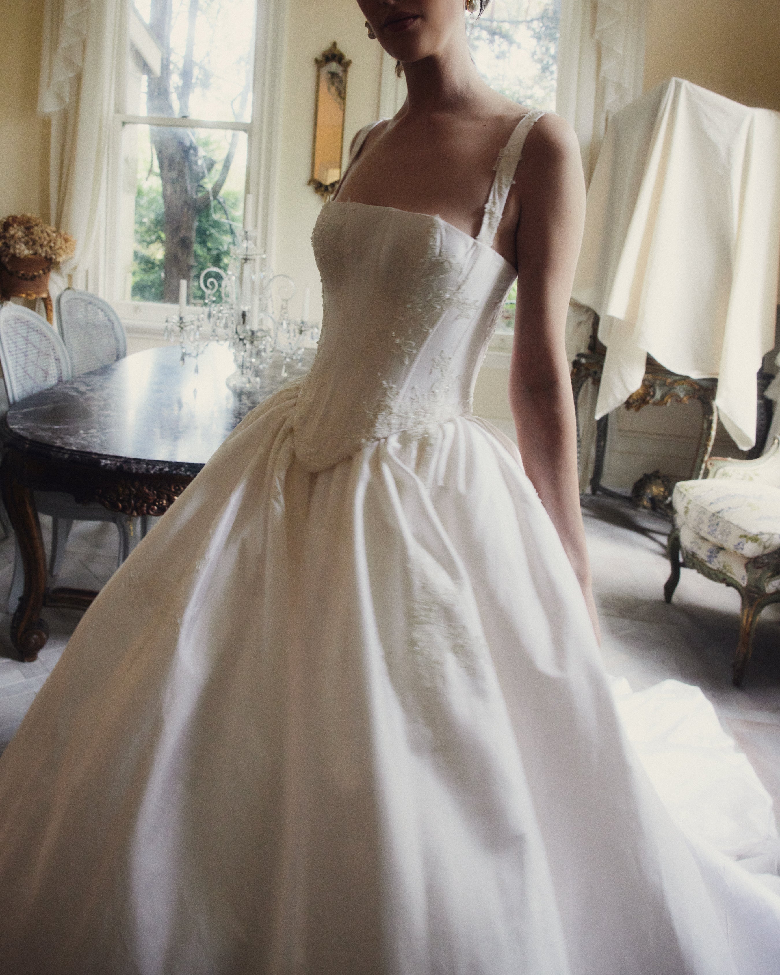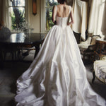 Vintage look of Silk Dupion gown with hand-beaded Chantilly French lace appliqué pairs with a modern twist corseted bodice in straight neckline style and bubbled hem details.
